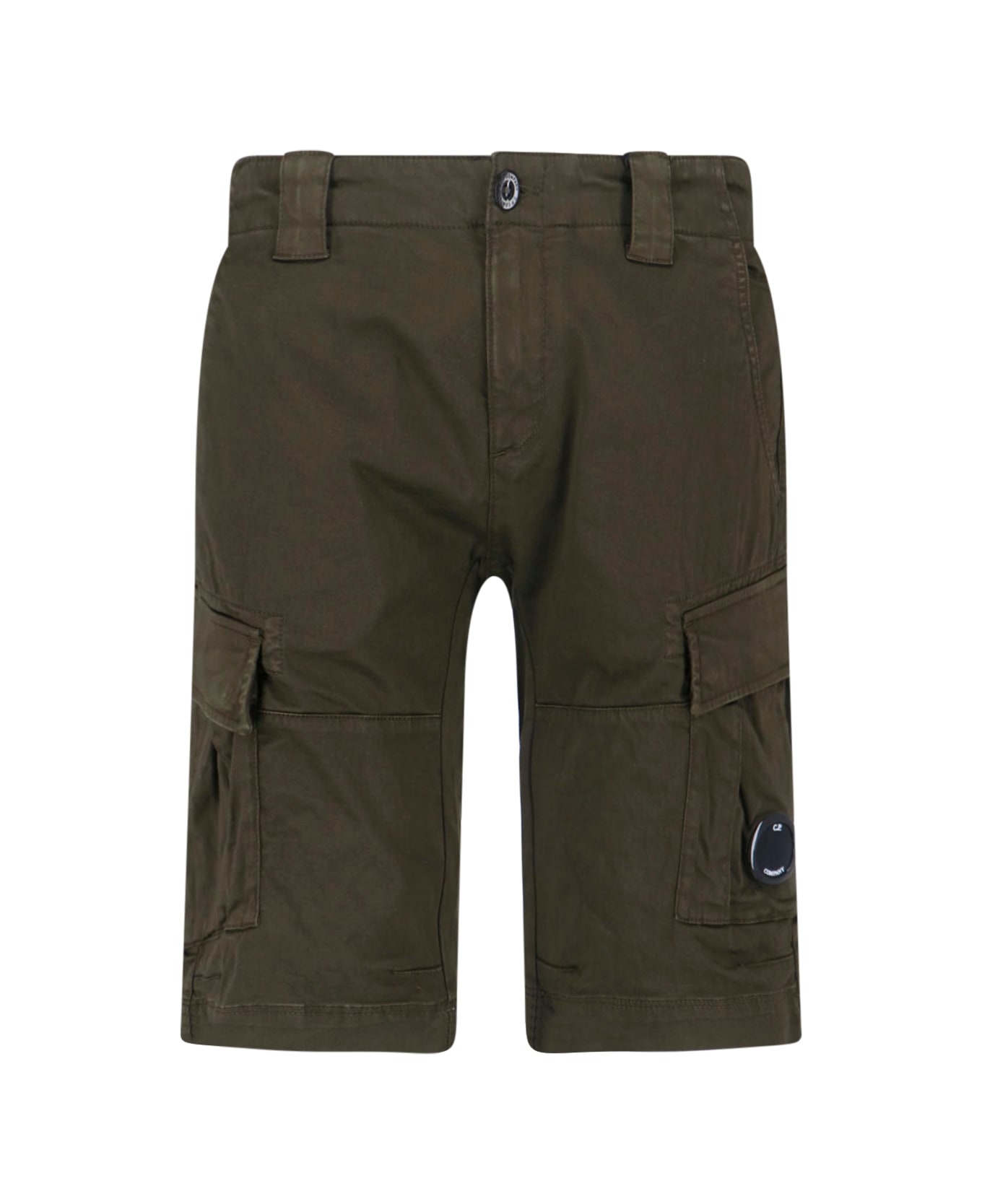C. P. Company "lens" cargo shorts in green stretch cotton with mid waist, button and zip closure, belt loops, two side slanted pockets, two side cargo pockets, "lens" detail, straight leg.