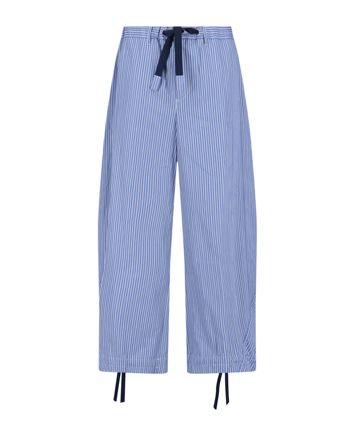 Sacai striped pants in blue cotton poplin with mid waist, adjustable drawstring at the waist, button and zip closure, belt loops, two back flap pockets, lacing details, straight leg. Composition: 100% Cotton