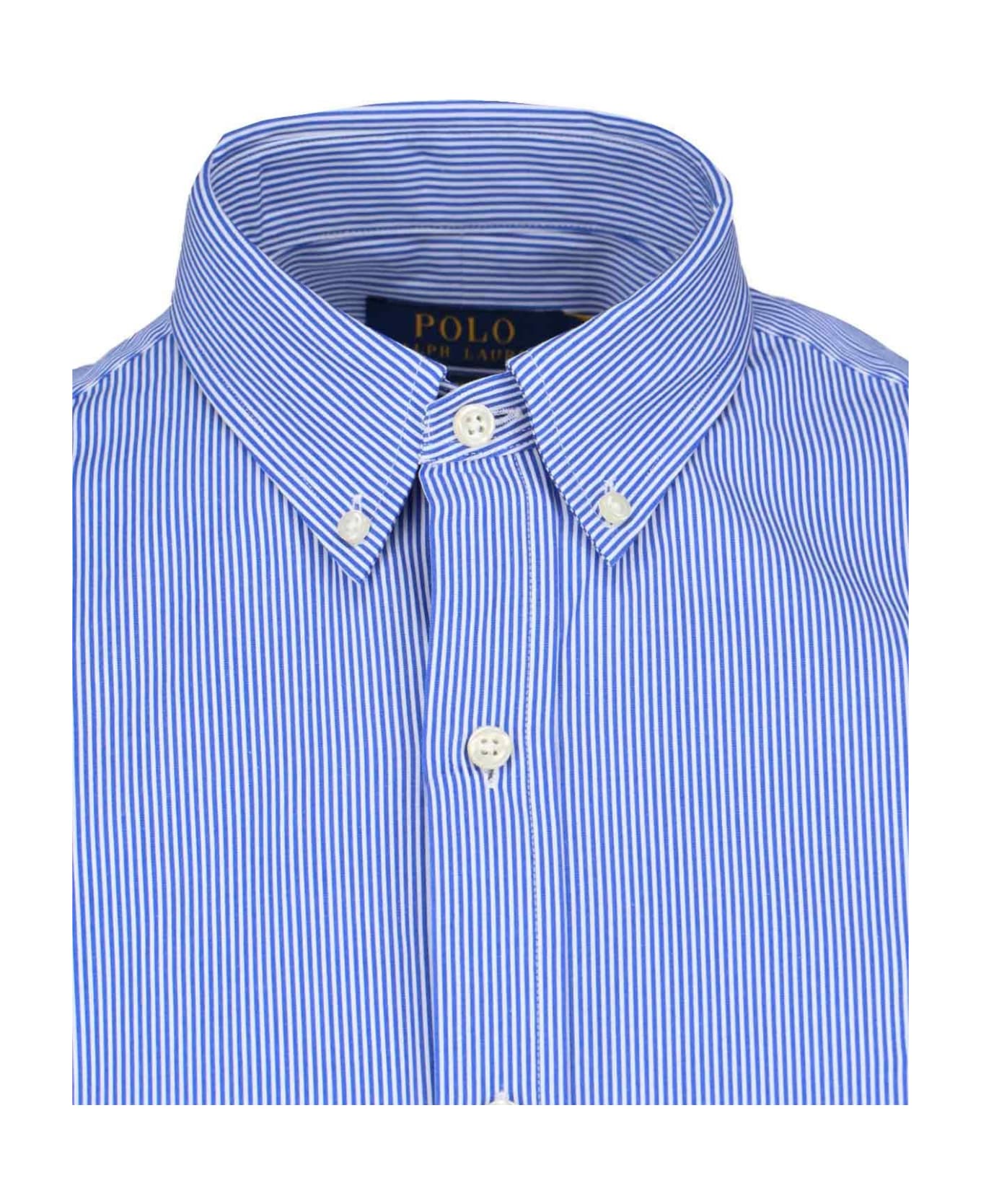 Polo Ralph Lauren polo Oxford shirt in light blue stretch cotton with white stripe pattern, classic collar, button closure, button cuffs, blue logo embroidery on the front, two back pleats, curved hem.