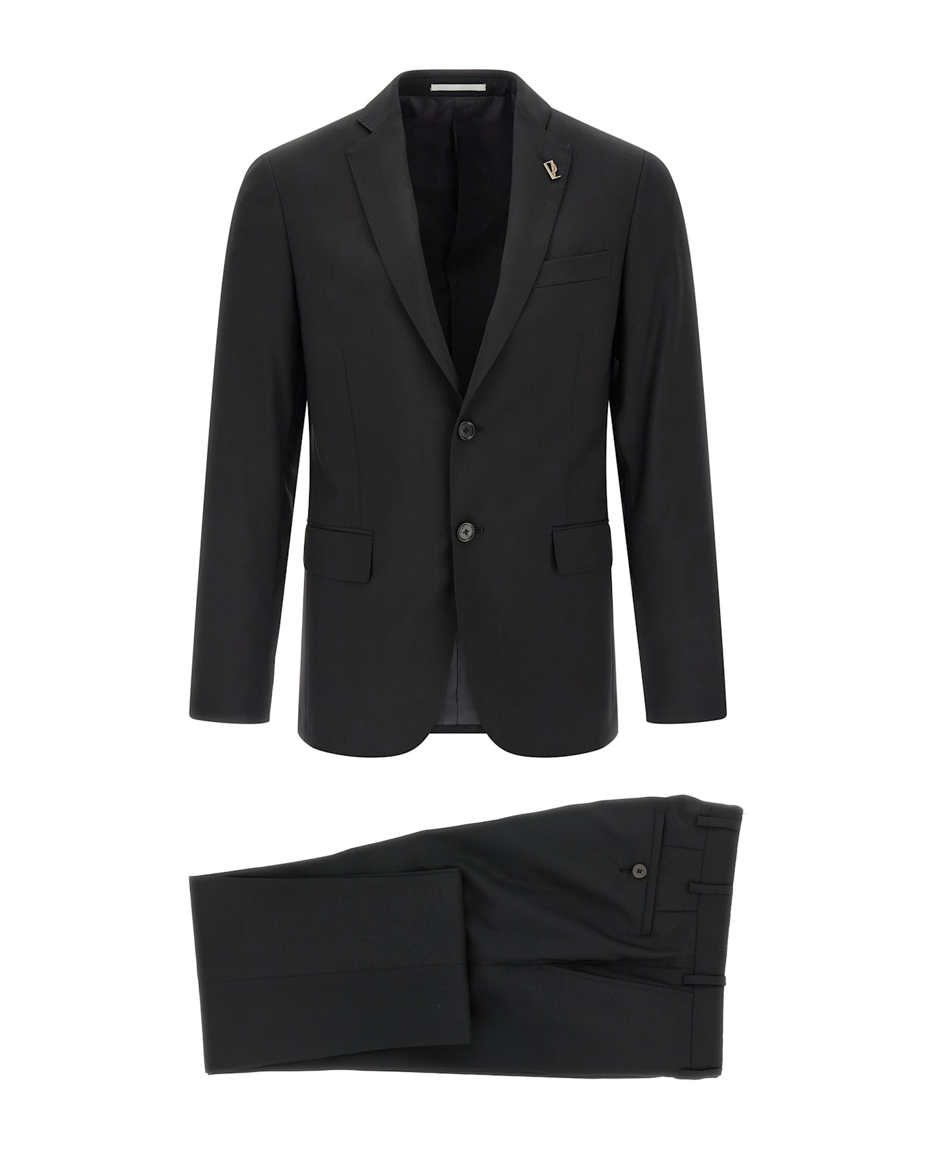 'Lord' wool dress consisting of single-breasted blazer with front button closure, mirror lapels with removable metal brooch, chest pocket, flap pockets, cupro lining, two inner pockets, structured shoulder strap, cuffs with opening buttonholes, back slits and trousers with stretched crease, front 'americane pockets', back welt pockets, front zip and button closure, viscose lining.