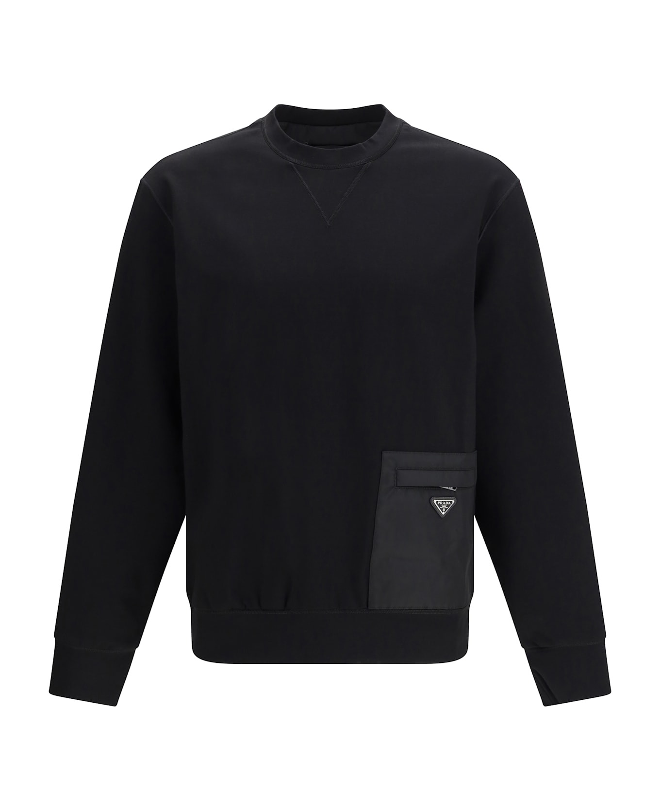 The stretch jersey sweatshirt by prada is crafted from flexible fabric that ensures comfort and a defined silhouette. it features a crew neckline and a re nylon zip pocket at the hem, enhanced by the iconic metal triangle logo on the front. the clean design combines functionality with the distinctive identity of prada. Composition: 65% % Viscose, 30% % Nylon, 5% % Elastane