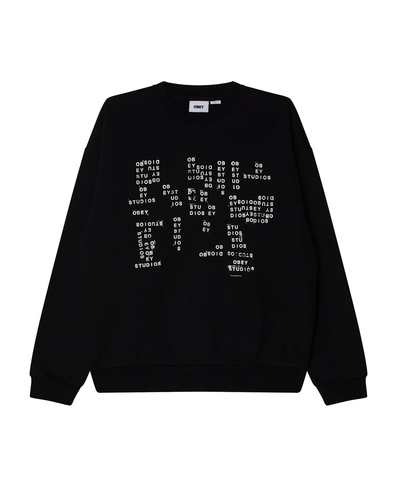 Black heavyweight crewneck fleece sweatshirt featuring a distinctive stamped design for a unique, contemporary look. Made from extra heavy fabric, it provides warmth and comfort perfect for a casual, modern style.