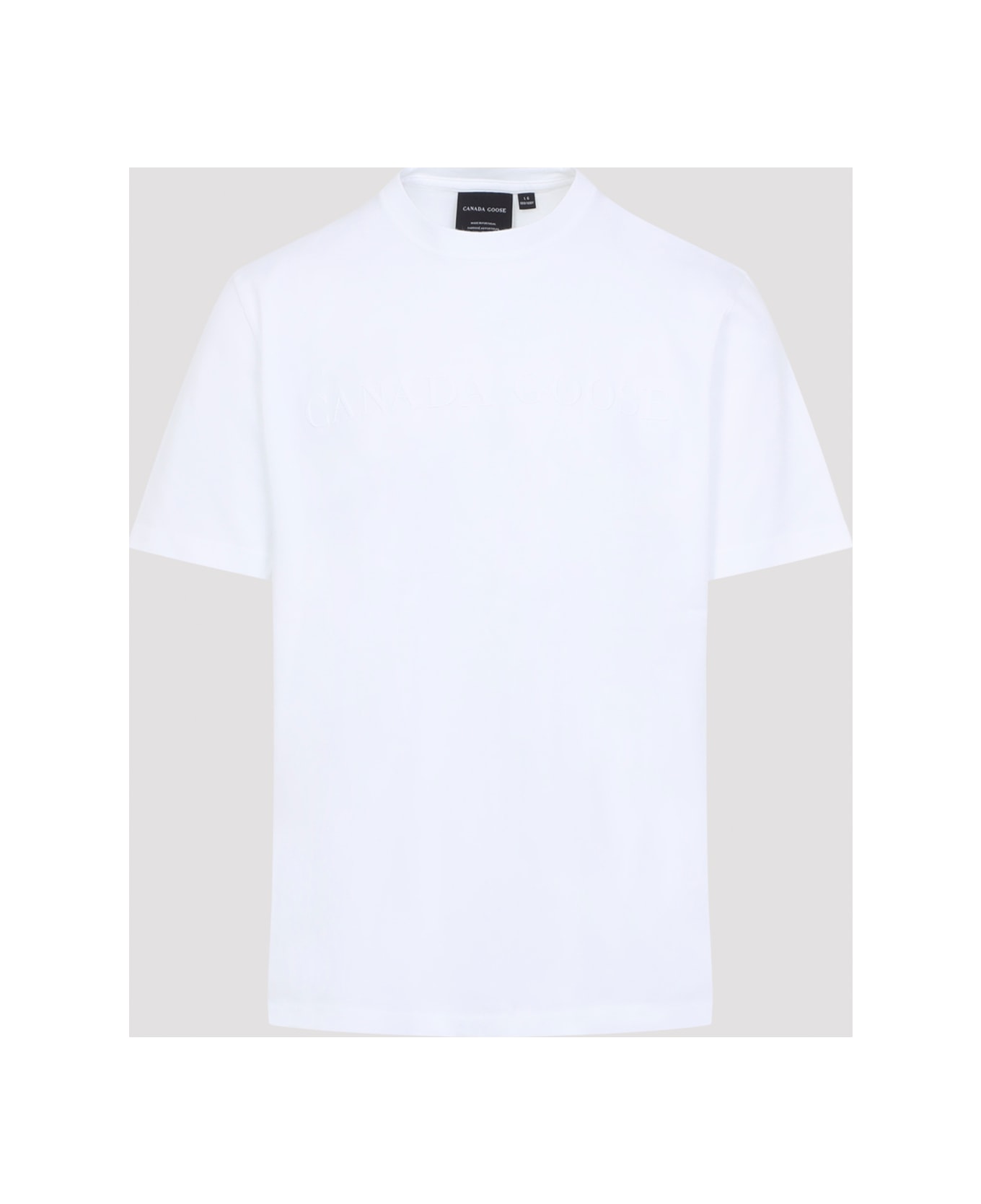 Canada Goose Optic White Cotton T-Shirt. Pure optic white cotton t-shirt, round neck, chest tonal embroidered lettering logo, short sleeves, straight hem.
