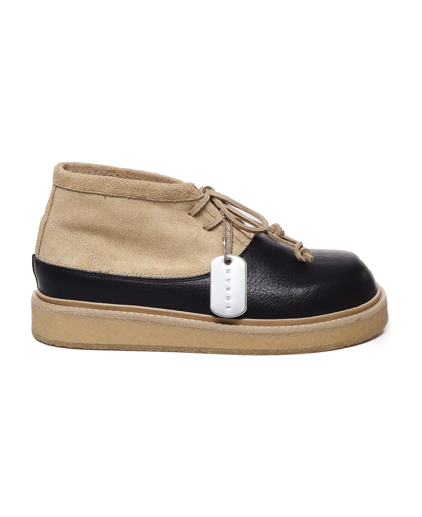-Beige suede upper -Closure with laces -Contrasting rubber sole -Removable metal plate with embossed logo -Made in Italy -Colour: Black, sand Composition: 100% Calfskin