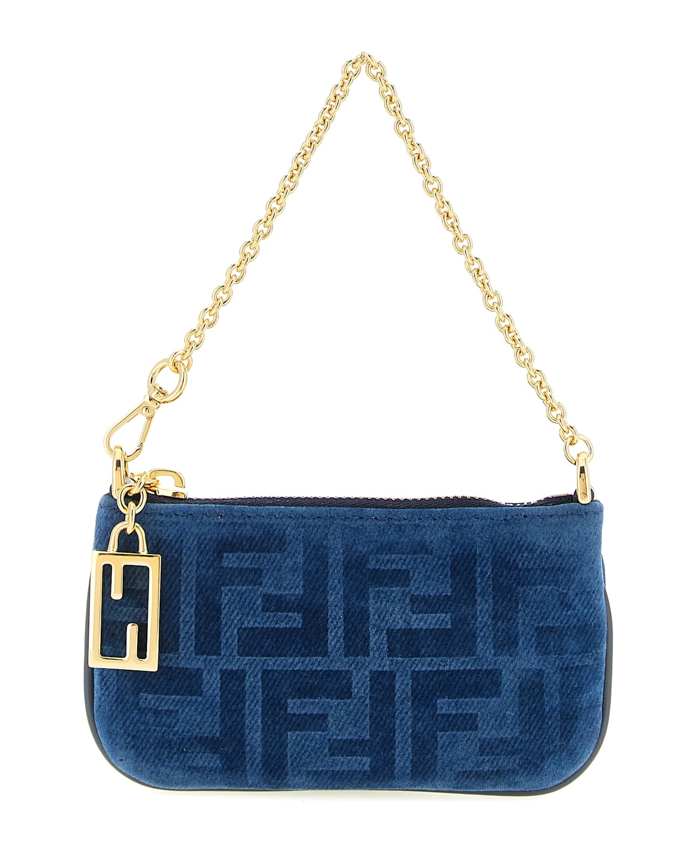 FF flocked cotton denim mini pouch with smooth tone-on-tone calf leather, zip closure with metal FF zipper puller, snap hook chain. Composition: 85% cotton 15% viscose