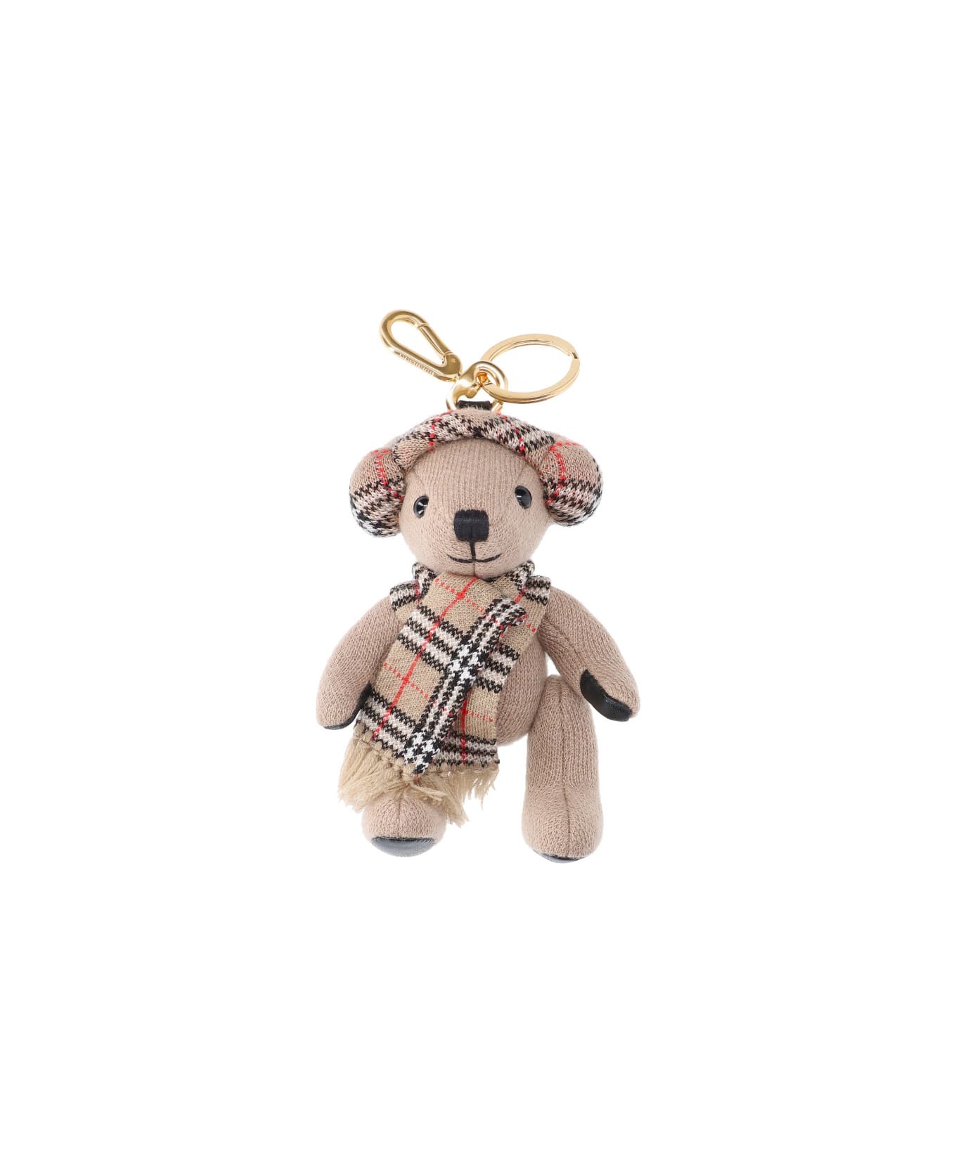 Burberry 'Thomas' bear keyring charm in multicolor wool and cashmere with check pattern, strap, gold metal tag, engraved logo detail, gold metal ring keyring, carabiner closure. Composition: 90% Wool, 10% Cashmere