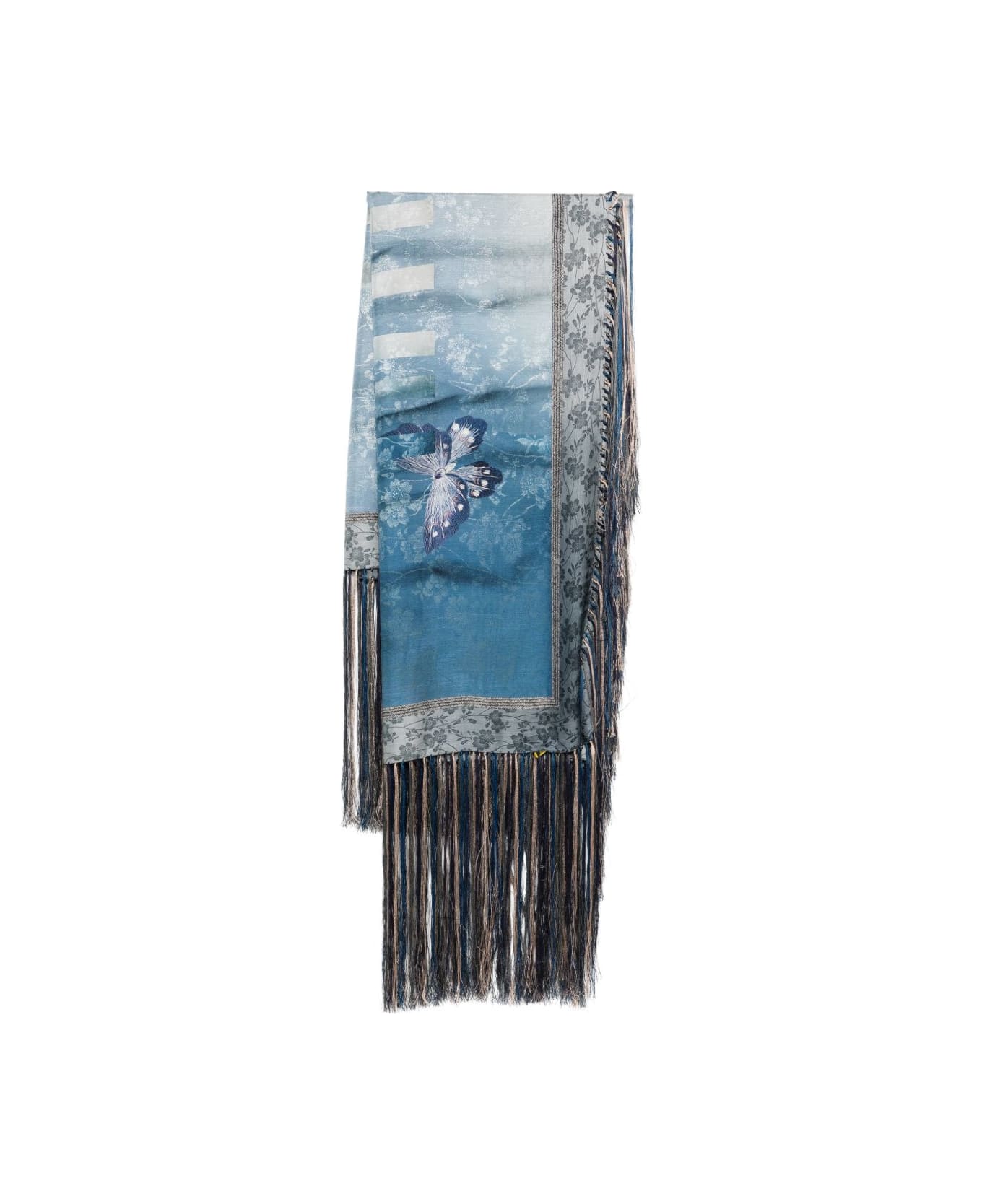 blue butterfly motif floral print fringed trim