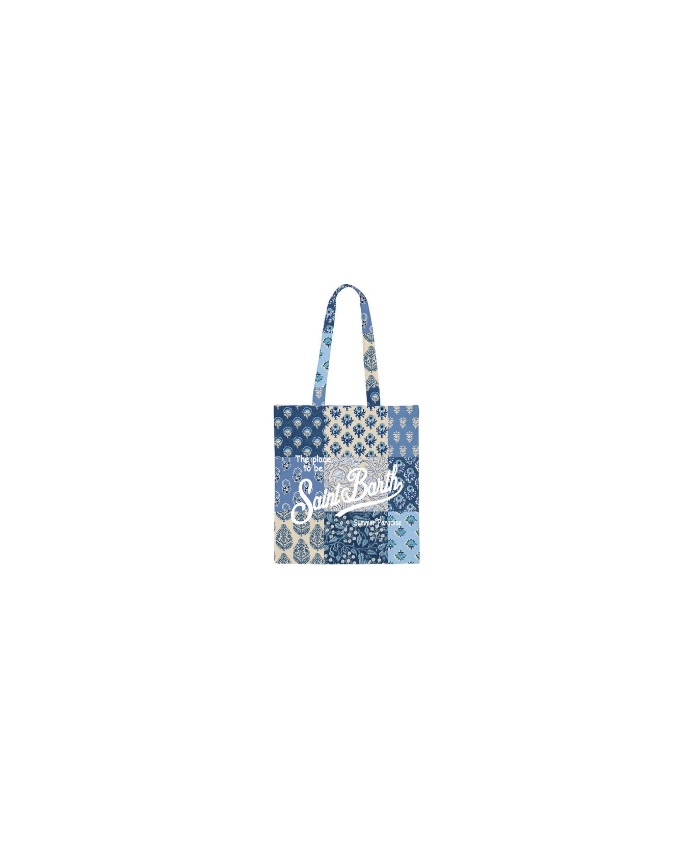 Essential cotton flat bag by MC2 Saint Barth, all-over floral patch print in shades of blue, exclusive Saint Barth logo printed in white. Dimensions: 42 x 37 x 10 cm