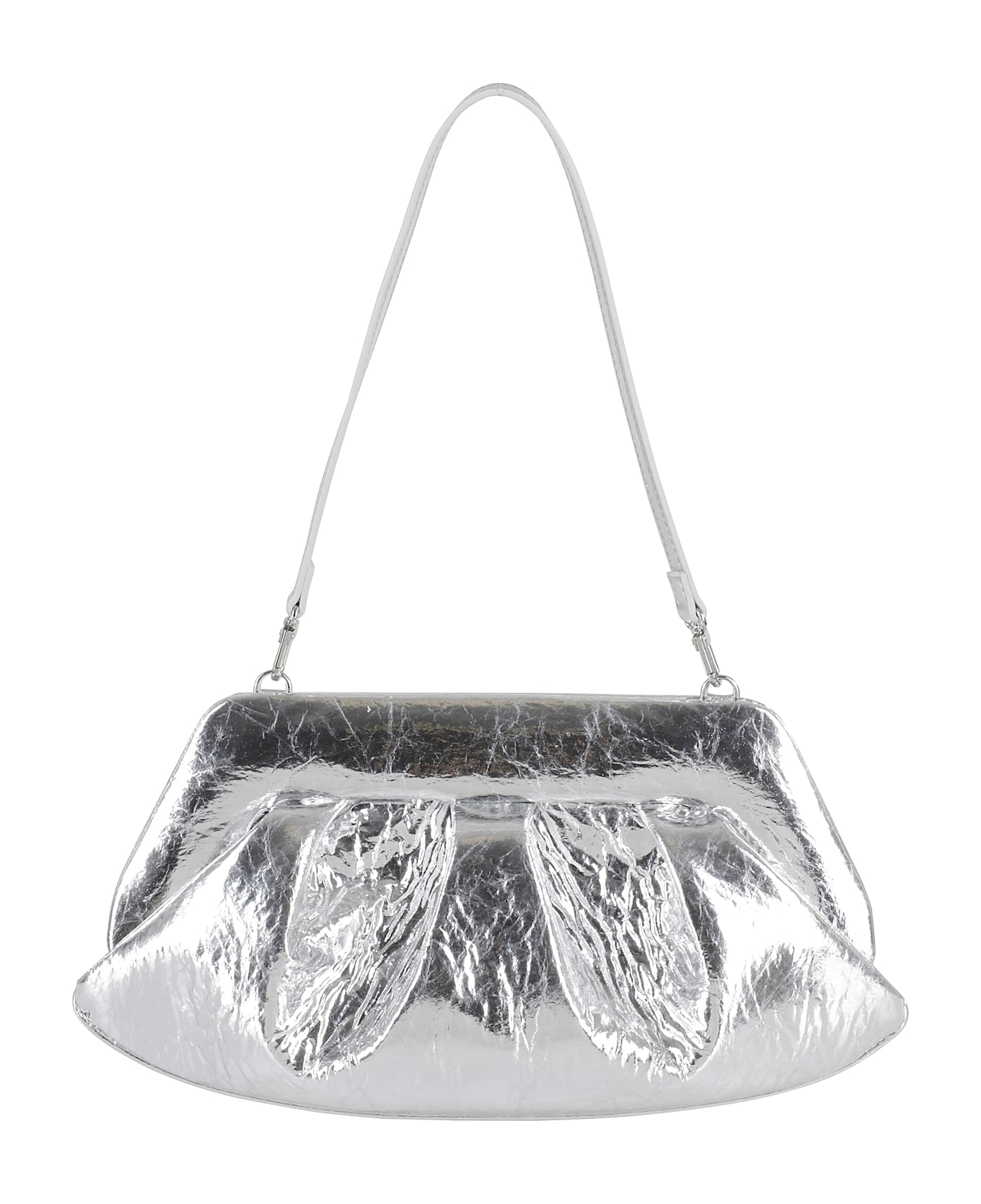 Emera bag -Themoirè -Silver color -Single interior compartment -Magnet closure -Eco vegan leather -Removable shoulder strap Size: 27cm x Height 17cm x Depth 11cm