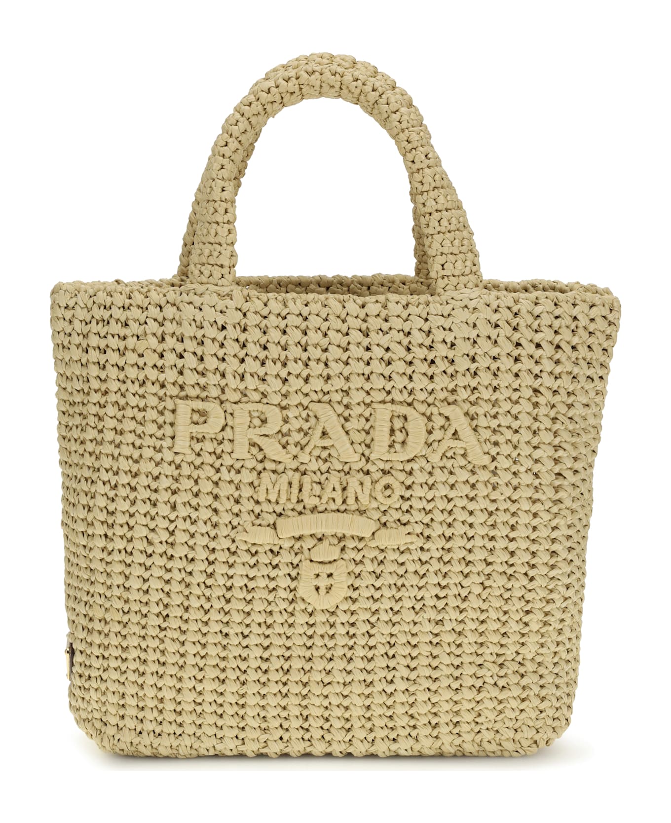 The straw handbag by prada is made from hand-woven raffia, offering a rigid and well-defined structure that enhances its elegant shape. the integrated double top handles ensure comfort and practicality, while the tone-on-tone embroidered logo on the front, featuring the iconic lettering and symbol, adds a sophisticated touch. the iconic triangular enamel logo applied to the side completes the distinctive design. the wide top opening makes this bag both functional and stylish, perfect for any occasion.