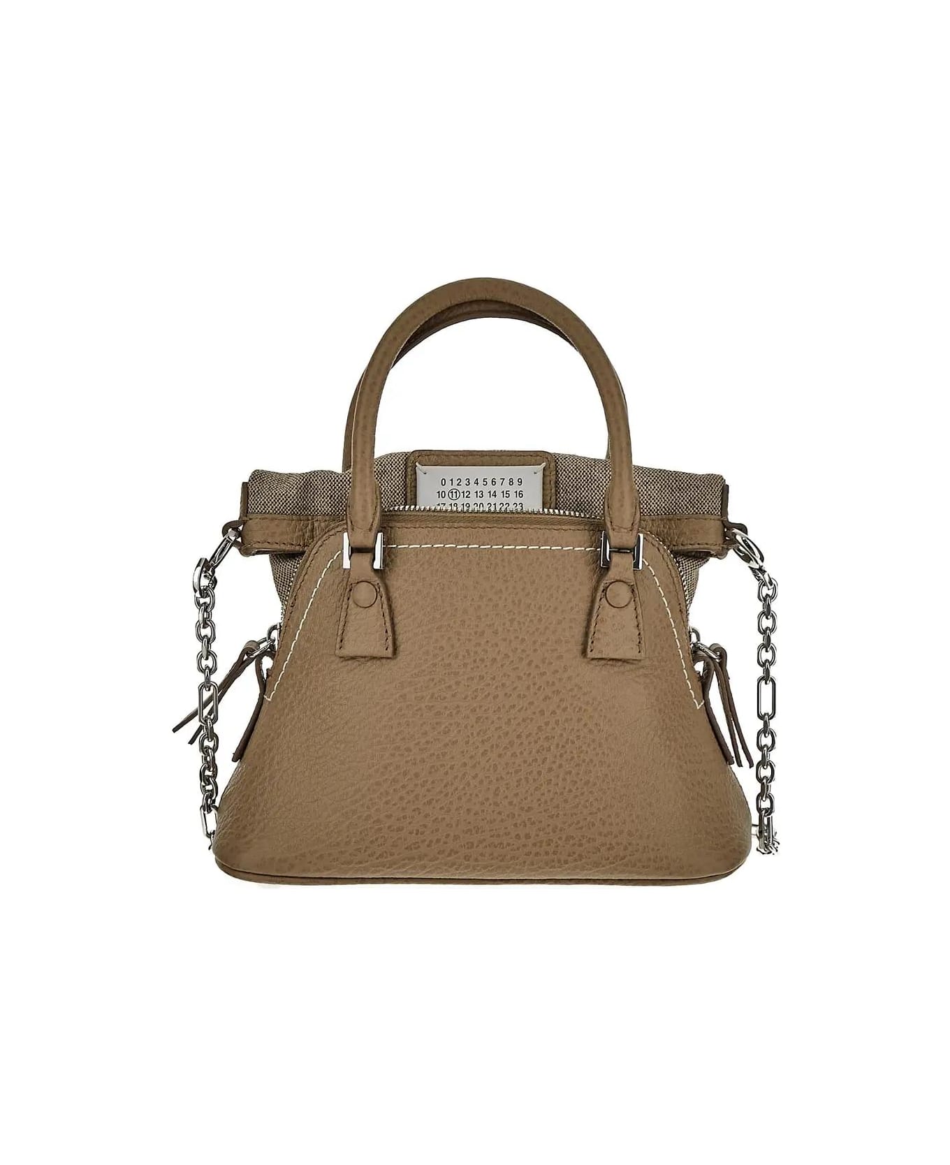 Maison Margiela bag in beige grained leather with top handles, logo patch, detachable chain leather shoulder strap, four white stitches on one side, top zip fastening, press button closure, a main compartment, flat pocket and silver-toned metal hardware.