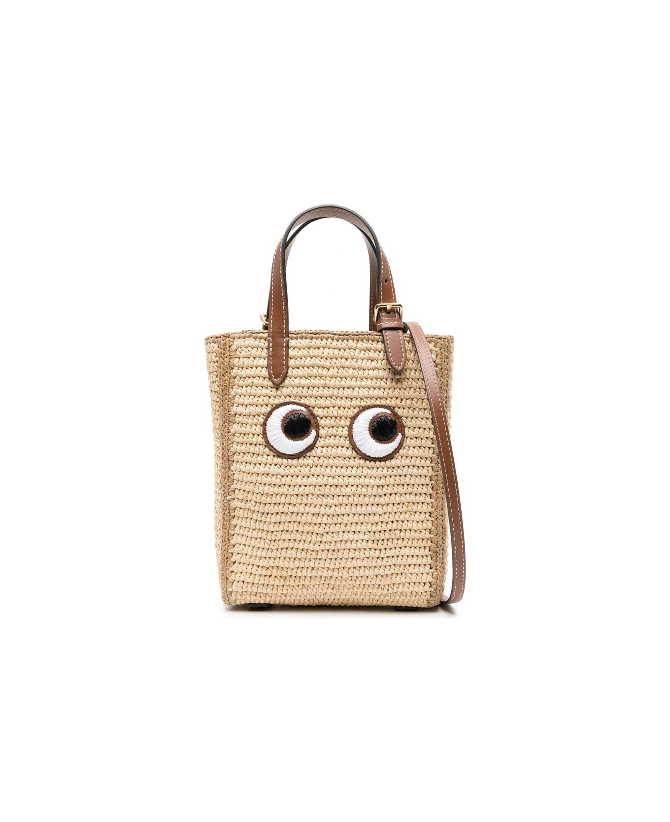 beige woven raffia design leather trim embroidered eyes to the front embroidered logo to the rear adjustable detachable leather shoulder strap two adjustable top handles open top main compartment internal logo patch unlined This piece comes complete with a protective dust bag.