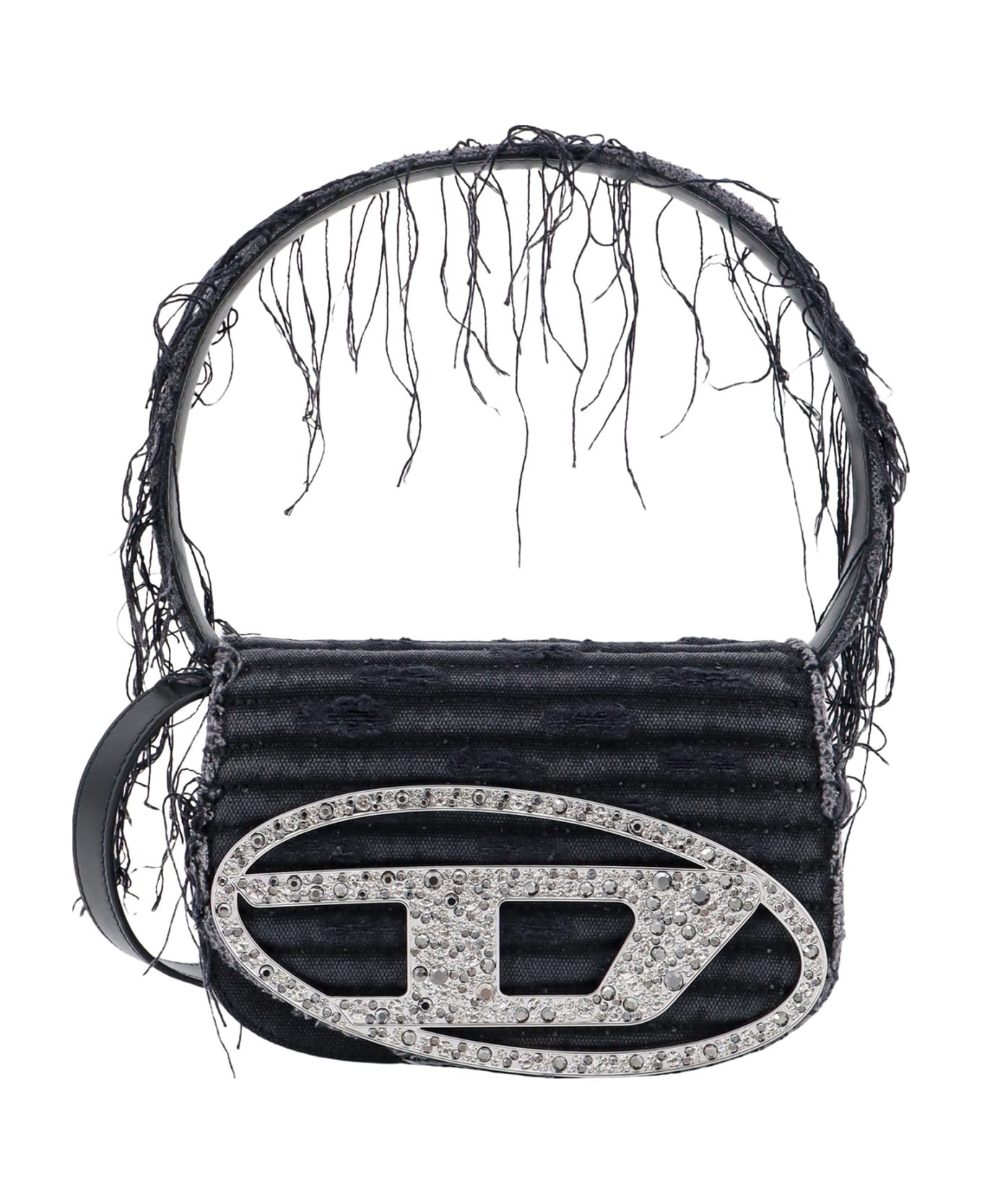 Denim shoulder bag with frontal Oval-D logo - Closure With Flap And Snap Button - Profiles With Fringes - Detail With Rhinestones - Internal Pocket - Canvas / Leather
