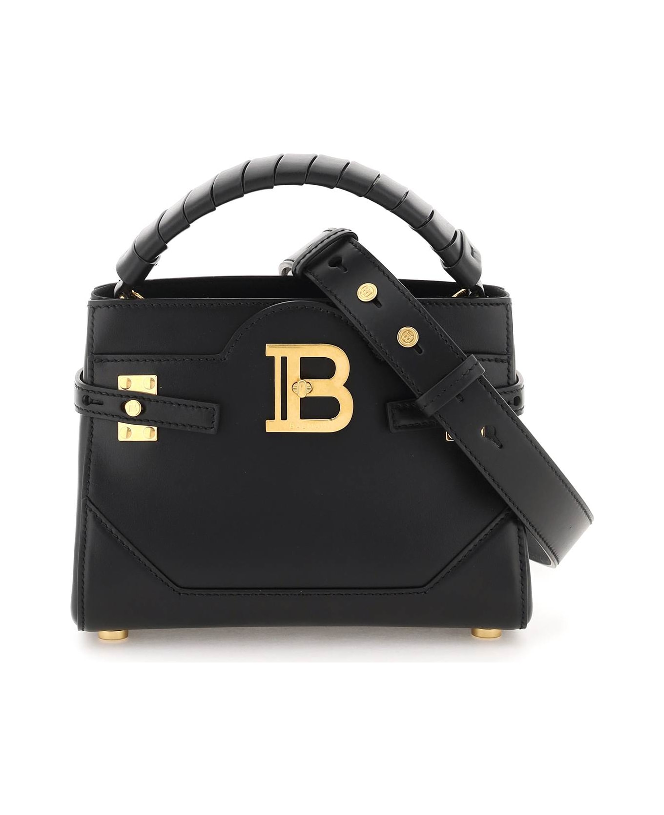 B-Buzz leather handbag by Balmian featuring a woven leather handle and metal 'B' closure. Microfiber interior with one snap-button pocket and one leather credit card slot. Adjustable and detachable shoulder strap and antique gold-finished metalware. Composition: 100% LH