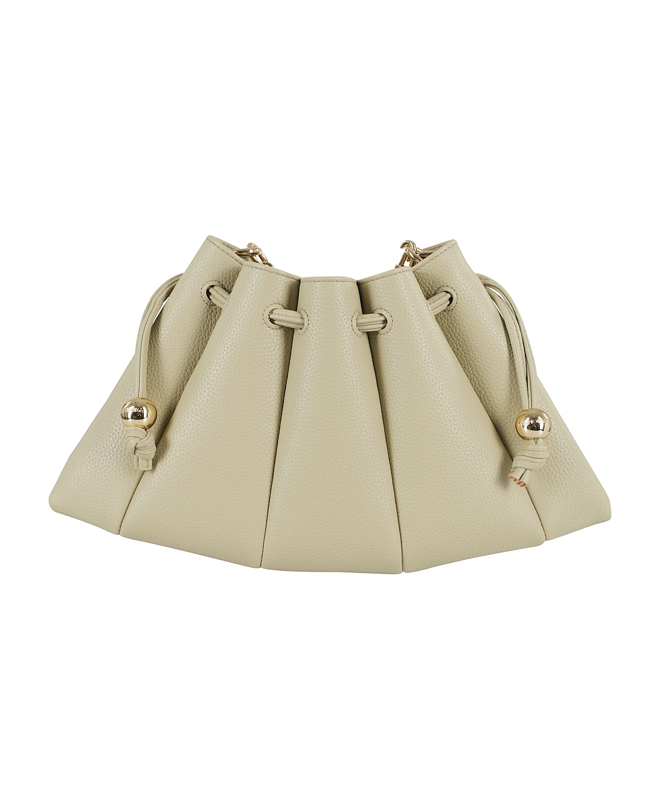 Dafne bag -Themoirè -Olive color -Single interior compartment -Shoulder strap -Small removable pocket inside -Drawstring closure Dimensions. Width 36cm x Height 21cm x Depth 3cm