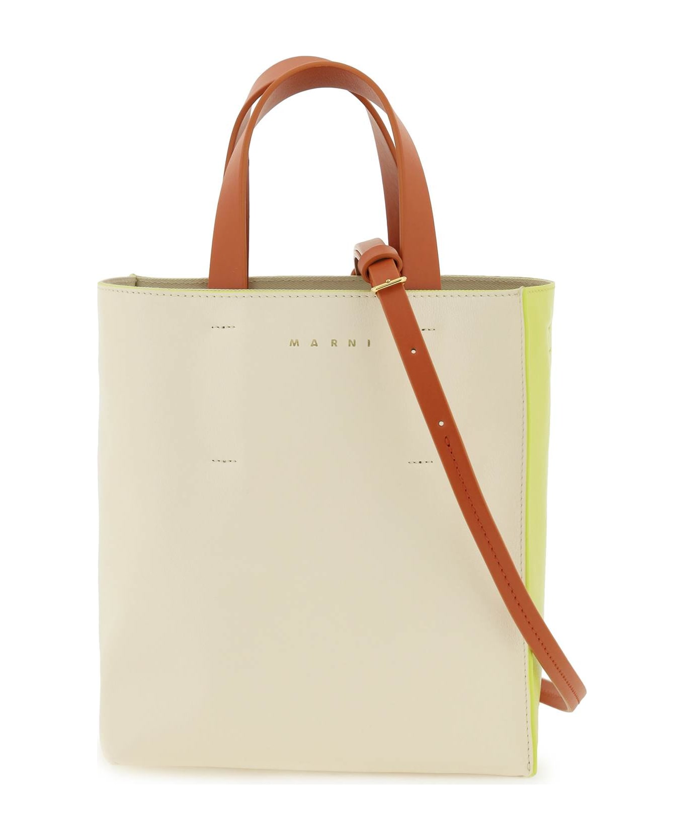 Mini Museo Soft shopping bag by Marni crafted in bicolour leather with front gold-tone logo print. Double top handle and removable and adjustable shoulder strap in contrasting leather. Cotton lining and one inner leather patch pocket with zip closure. Gold-finished metalware.