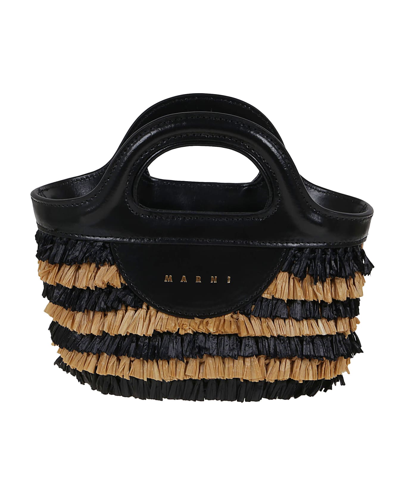 Micro Tropicalia bag BY MARNI. Made of leather and woven raffia with fringes. Portable by hand and shoulder strap. Handles with embossed details. Leather bottom. Detachable leather shoulder strap. Leather closure. Gold hardware. External golden logo detail on the front.
