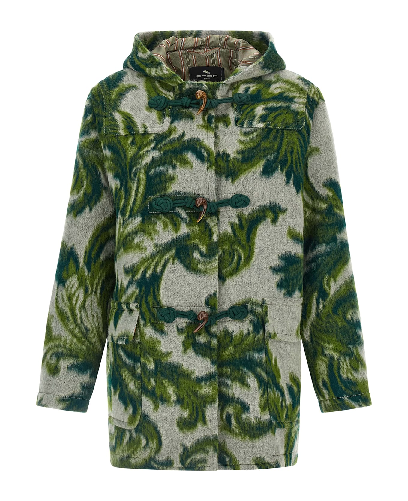 Patterned carded wool jacket, hood, front toggle closure, pockets, long sleeves, viscose blend lining. Composition: 80% wool, 20% polyamide