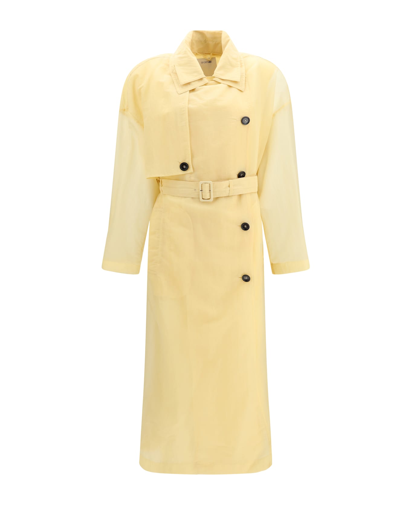 The fata trench coat by sportmax is a two-piece design with a metallic finish, offering a contemporary look. it features dropped shoulders, a storm flap on the right side with button, and a long belt with a fabric-covered buckle that enhances the silhouette. the style is completed with a detached back yoke and a regular fit, combining modern elegance with distinctive details.