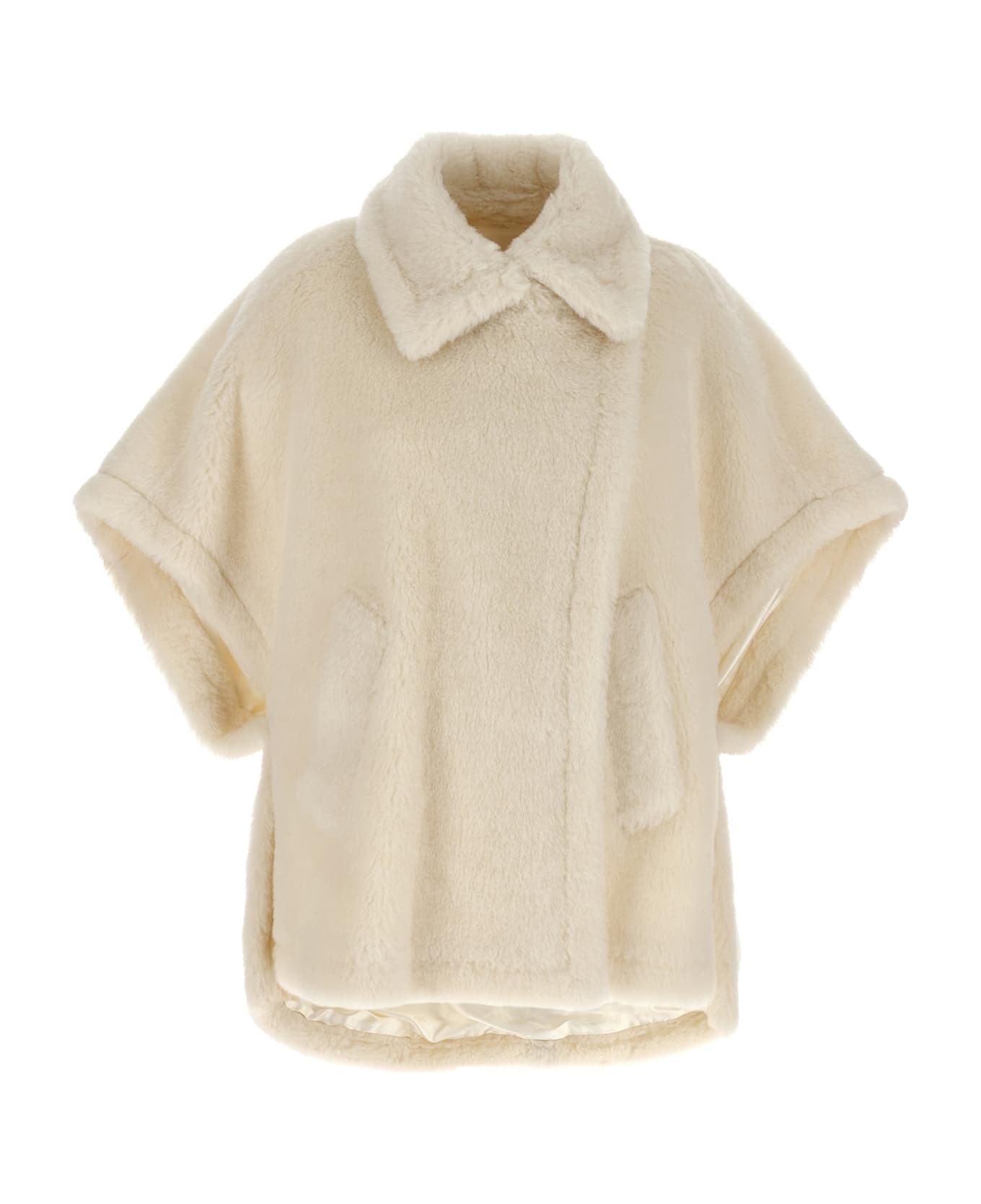 'Tebe1' cape in alpaca and wool Teddy fabric on a silk base, double-use collar to wear open with lapels or closed with button, asymmetric button closure, pockets, short kimono sleeves, viscose lining.
