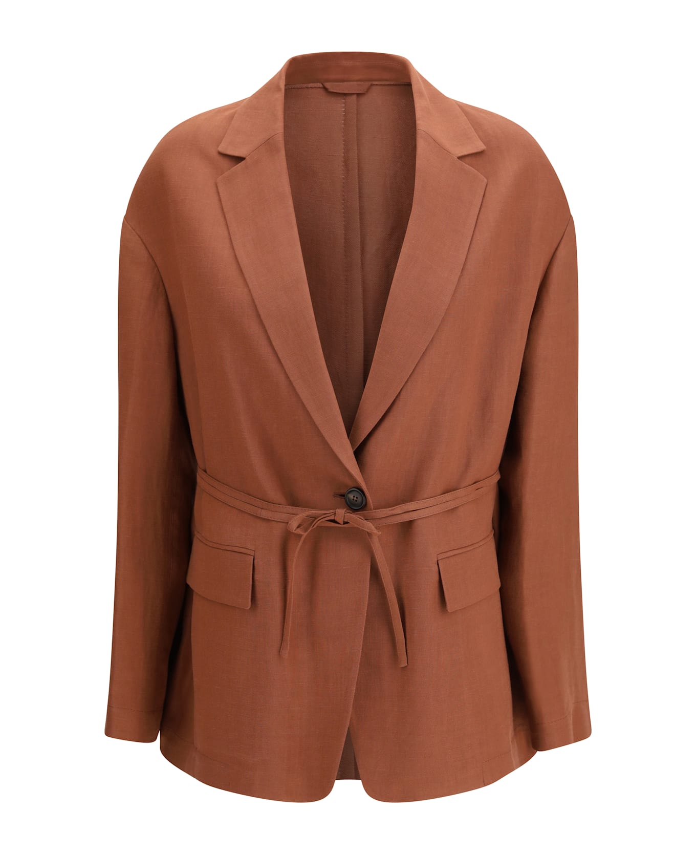 The monili-embellishment blazer by brunello cucinelli is crafted from fluid viscose and linen twill, a lightweight and fluid fabric that combines softness with a slightly crisp hand, enhancing the silhouette with natural elegance. the design features classic lapels, long sleeves, and wide front flap pockets inspired by safari jackets. a horn-button front fastening preserves the refined, minimalist aesthetic, while the removable tie belt defines the waist and shapes the volume. a single back vent completes the construction. the iconic nickel-free monili embellishment adds a luminous, precious touch to the front pockets, expressing the maison s distinctive sophisticated style.