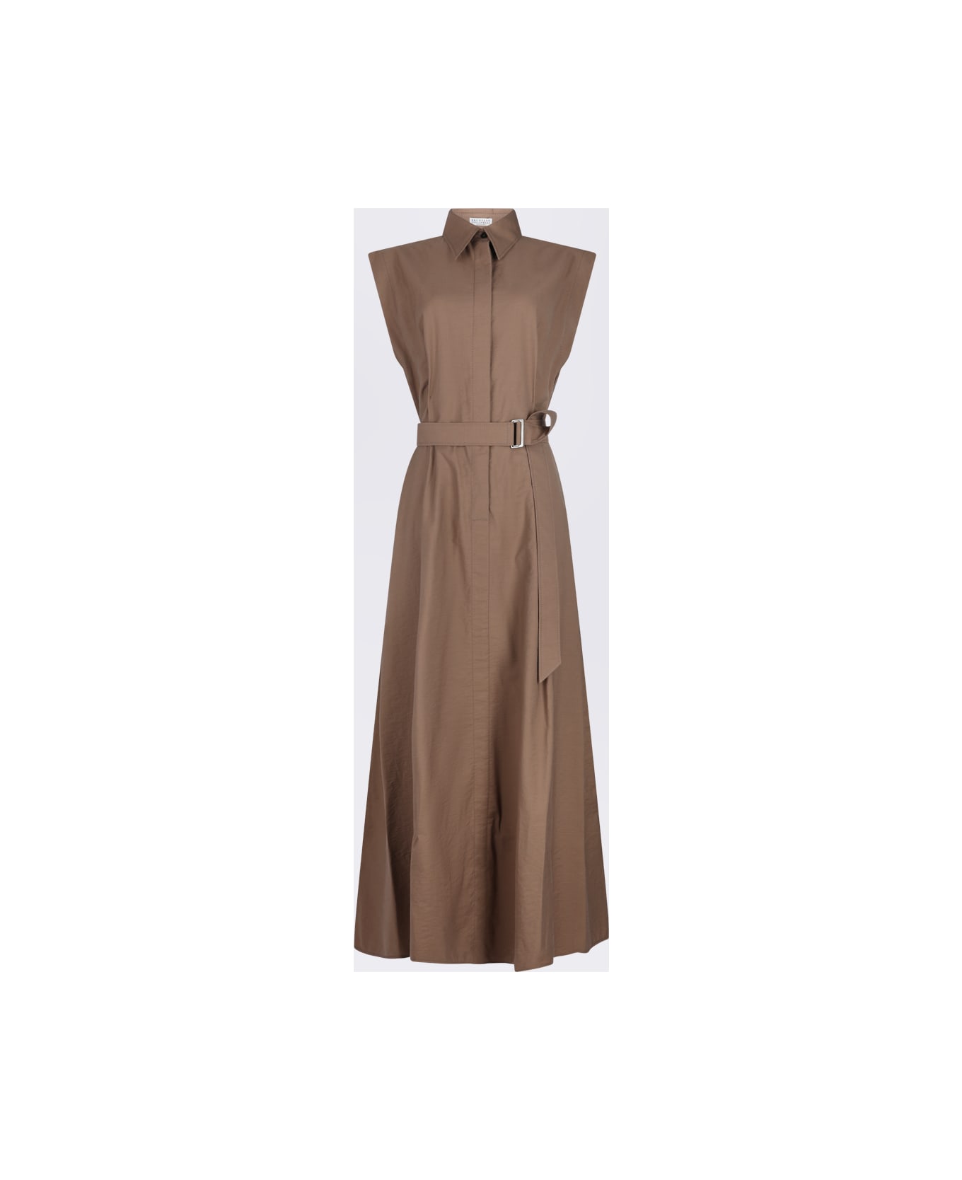 Brown cotton dress from Brunello Cucinelli featuring classic collar, sleeveless, matchy belt waist, frontal buttons fastening and long lenght. Composition: _, 86% Cotton, 14% Polyamide