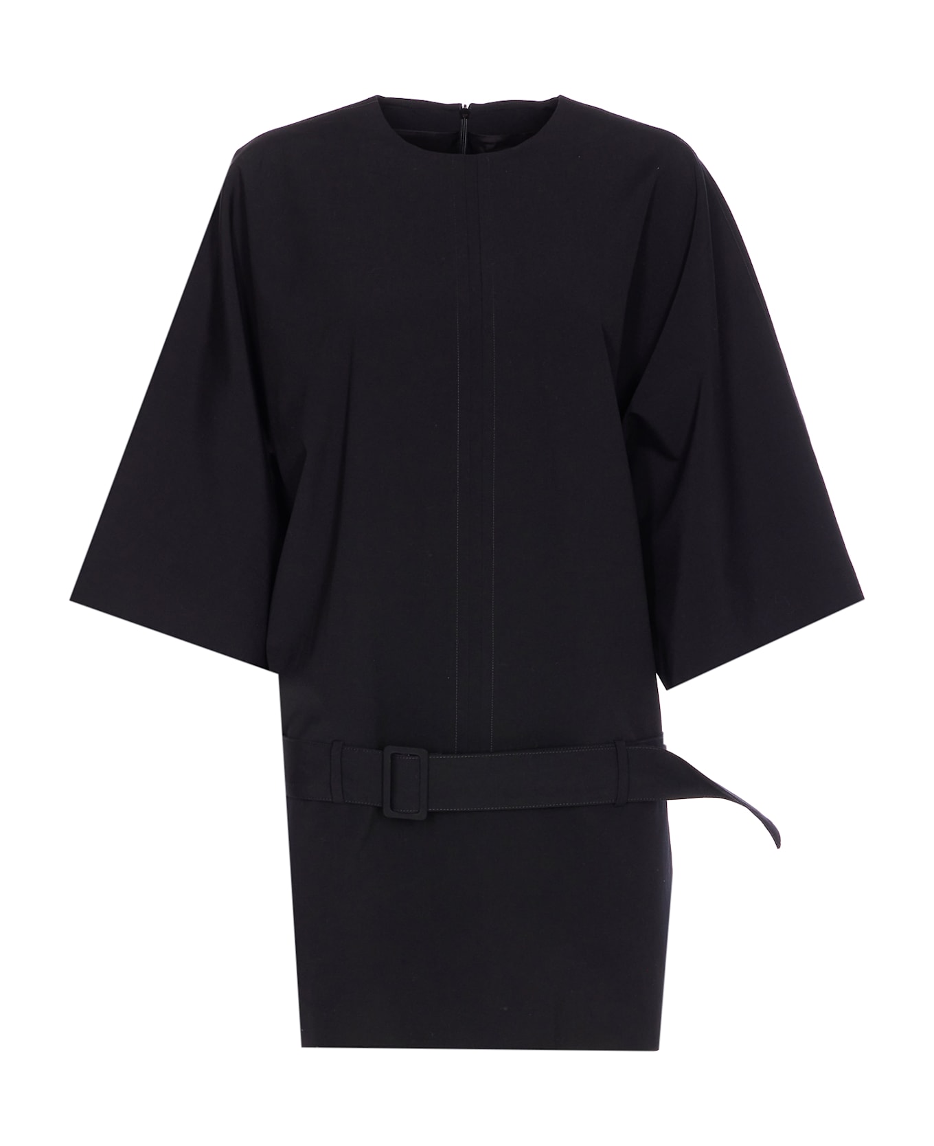 MM6 Maison Margiela black dress, zip closure on the back, crewneck, wide model, belt detail, mini model Composition: 67% Virgin Wool, 30% Cotton, 3% Elastane, 100% Viscose