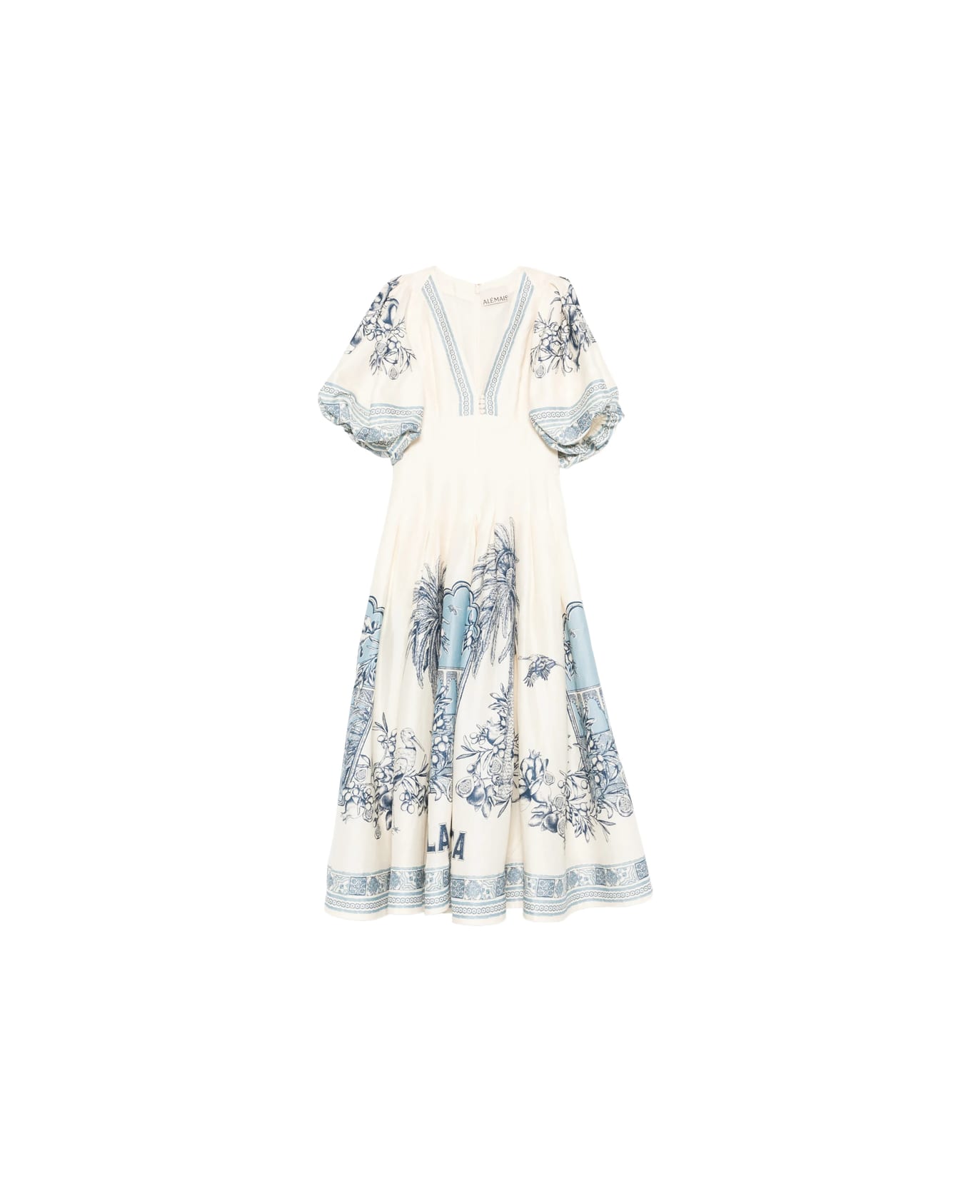 cream patterned V-neck puff sleeves mid-length