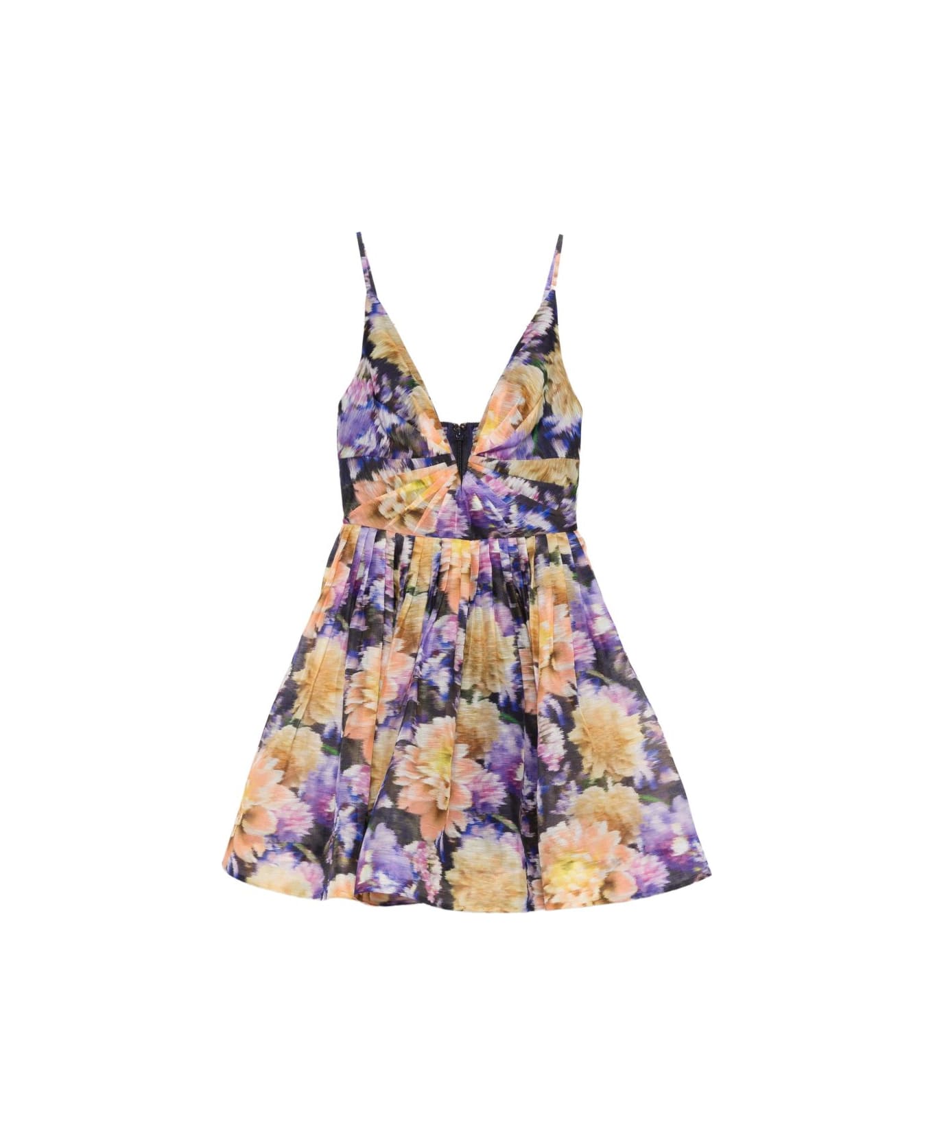 purple/yellow, floral pattern, zip fastening, deep V-neck, adjustable straps. Composition: 55% Linen, 45% Silk