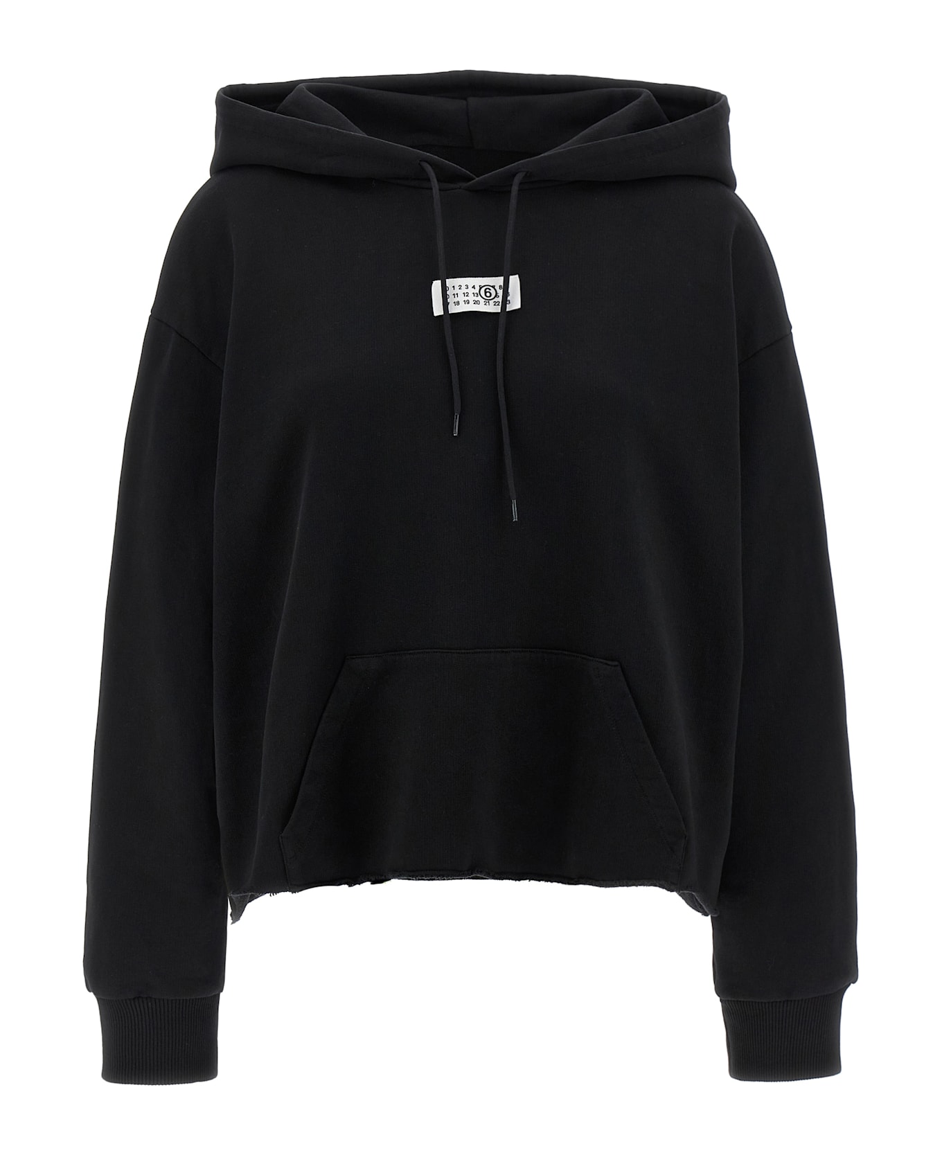 Brushed cotton hoodie with contrast 'Numeric signature MM6' logo patch on the front, kangaroo pocket, long sleeves with cuffs and dropped shoulders, raw cut hem and 'White stitch line' on the back.
