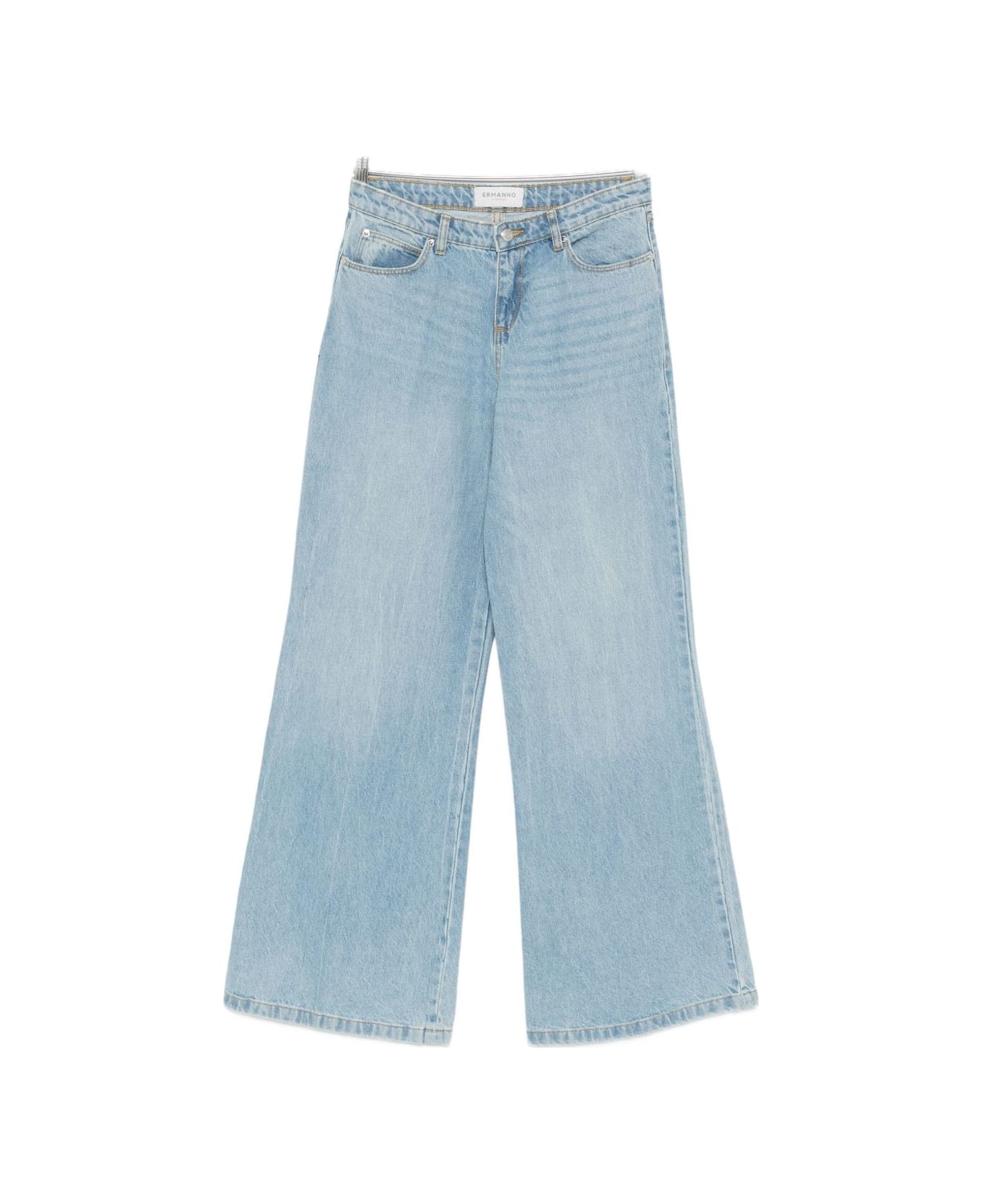 blue five pockets belt loops topstitching wide leg button and zip fastening