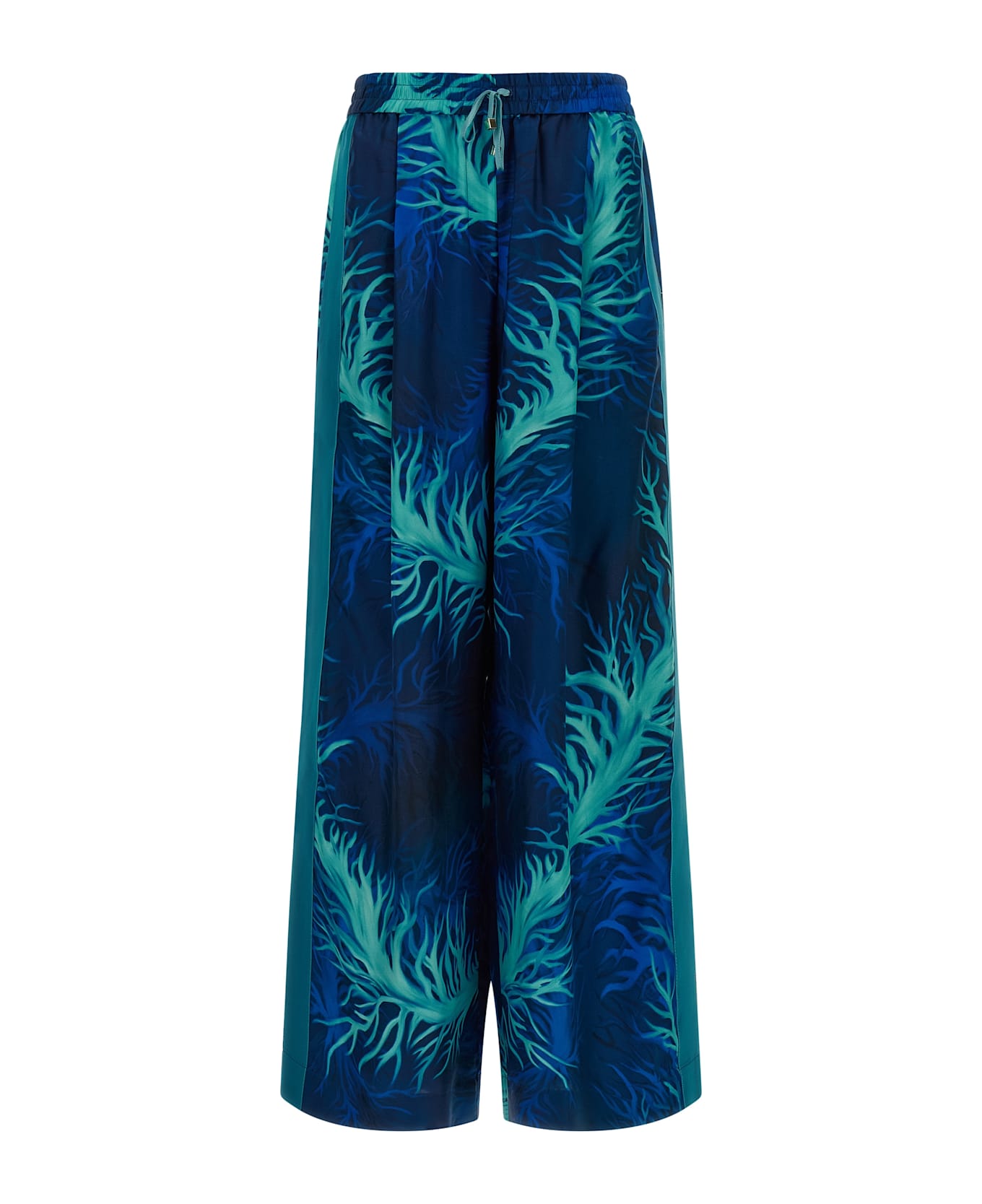 'Asteria' all-over 'Corals' print silk twill pants, wide and straight leg, adjustable drawstring elastic at the waist, front pleats, tone-on-tone grosgrain bands on the sides, pockets.