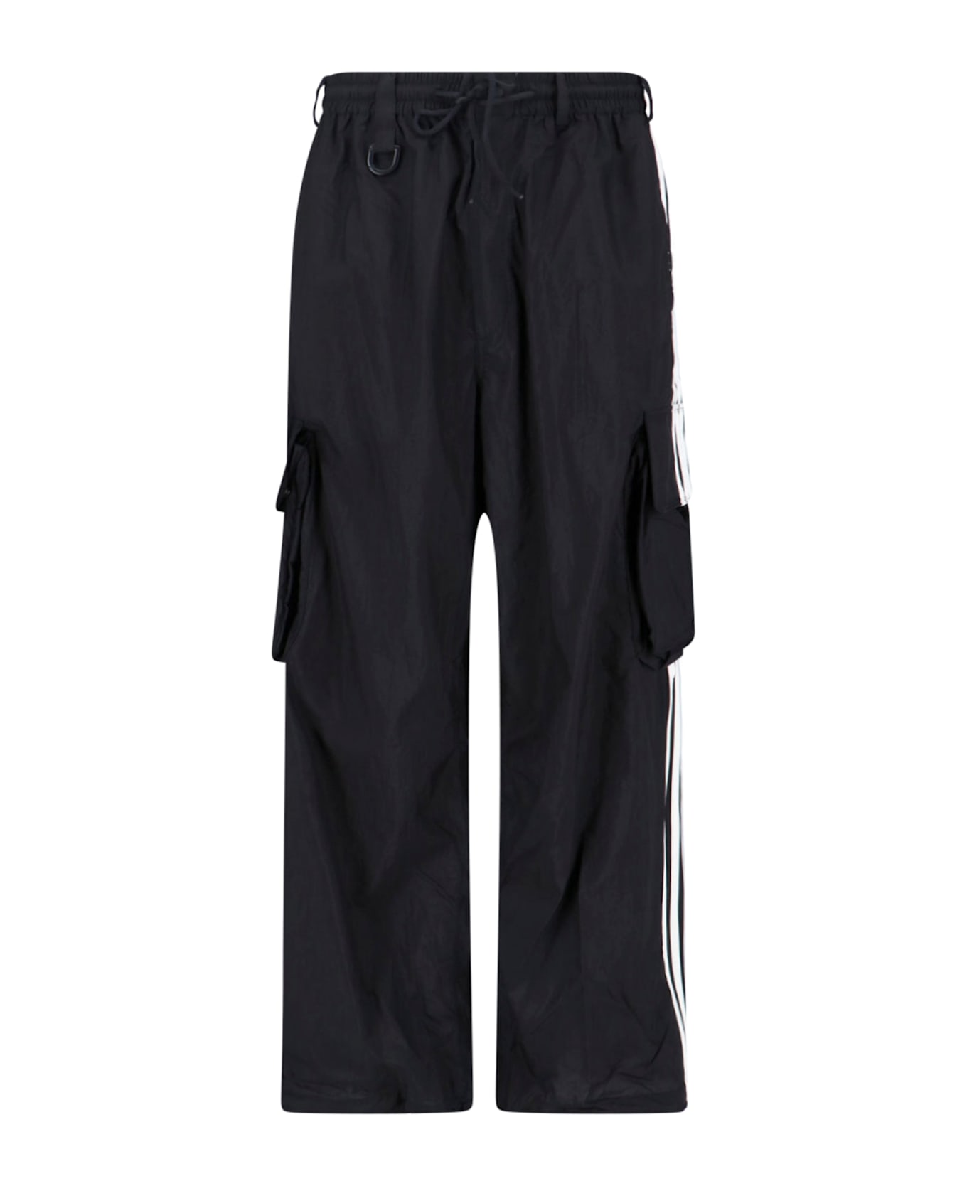 Y-3 cargo sports pants in black fabric with mid elastic waistband, belt loops, button and zip closure, adjustable drawstring, iconic side bands, two side cargo pockets, contrast mesh logo print, two flat back pockets, straight leg.