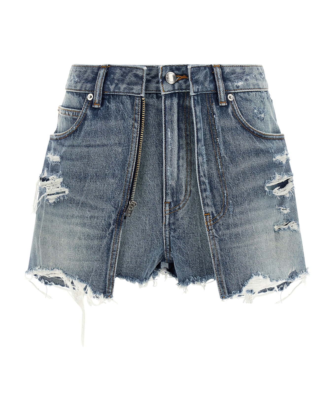 Double layer skort in used-effect stone washed cotton denim with rips and breaks, contrast stitching, front zip and button closure, five pockets, back leather logo tag, leg bottoms with frayed raw cut hem.