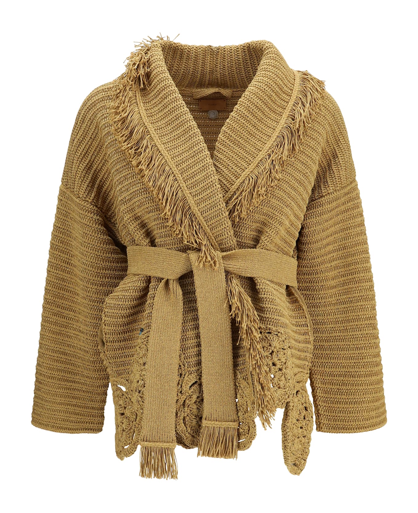 The island memories cardigan by alanui evokes the atmosphere of faraway shores, reinterpreted with crocheted details and handmade granny squares. made in italy from recycled cotton blend, it offers an original icon fit, embellished with a matching belt and fringes along the collar. a garment that blends traditional craftsmanship and sustainability in a unique and charming design.
