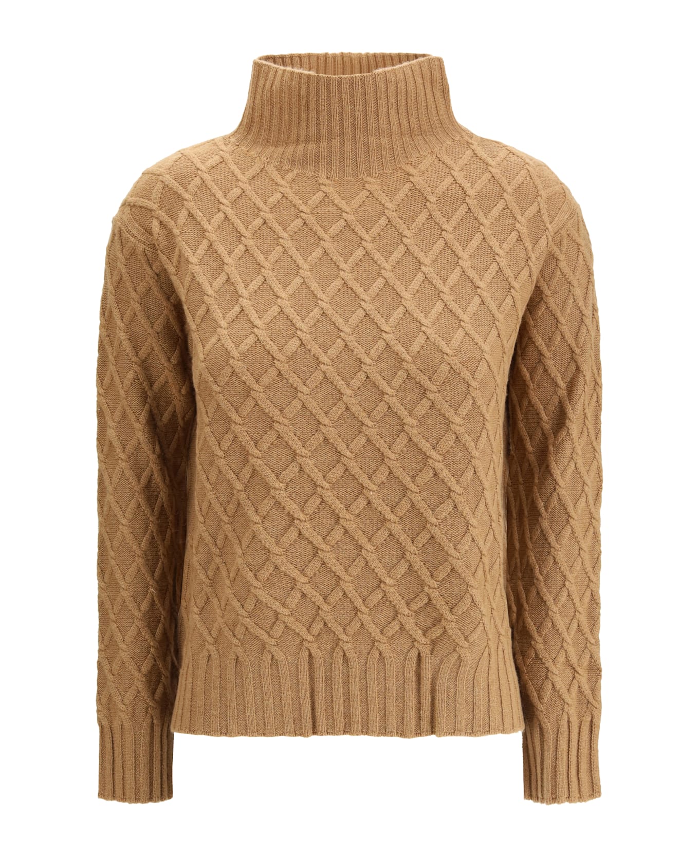 The turtleneck sweater by max mara pure is crafted from pure camel yarn and features an all-over cable knit pattern that lends it timeless elegance. the silhouette is semi-fitted, enhanced by long sleeves with dropped shoulders for a relaxed yet refined look. ribbed trims provide structure, while the branded leather label applied at the hem adds a signature finishing touch.