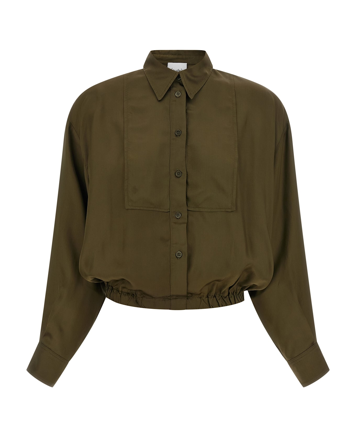 Fluid viscose shirt, plastron, front button closure, long sleeves with cuffs and dropped shoulder, elastic on the hem. Composition: 100% viscose