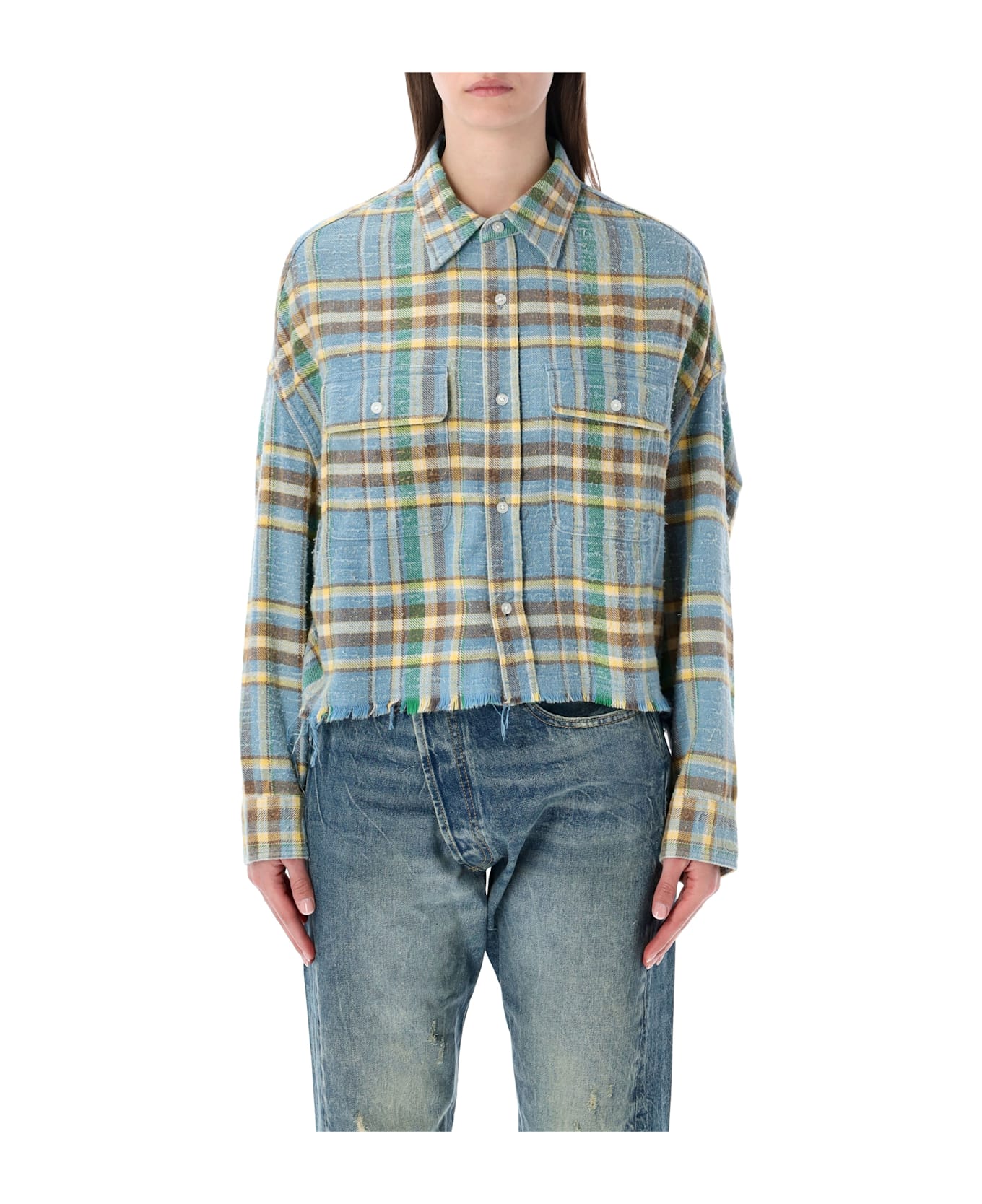 The Cropped Work Shirt By R13 Delivers A Contemporary Take On Utility Wear Infused With The Brand s Signature Grunge Attitude. Featuring An All-over Check Pattern, It Is Designed With Dropped Shoulders And A Loose Fit, Balanced By A Cropped Length For A Modern Silhouette. Classic Details Such As The Spread Collar And Flap Chest Pockets Are Contrasted By A Raw, Frayed Hem, Giving The Piece A Worn-in, Effortlessly Urban Appeal. All-over Check Pattern