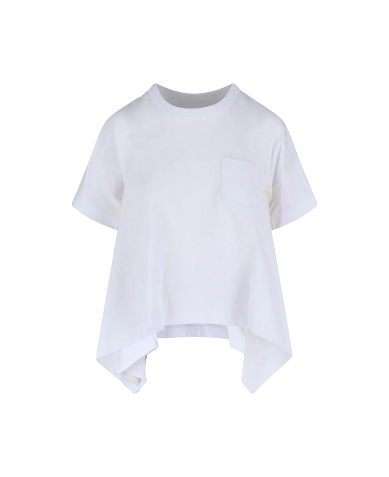 Sacai asymmetrical white cotton crew neck t-shirt with short sleeves, dropped shoulders, asymmetric hem.