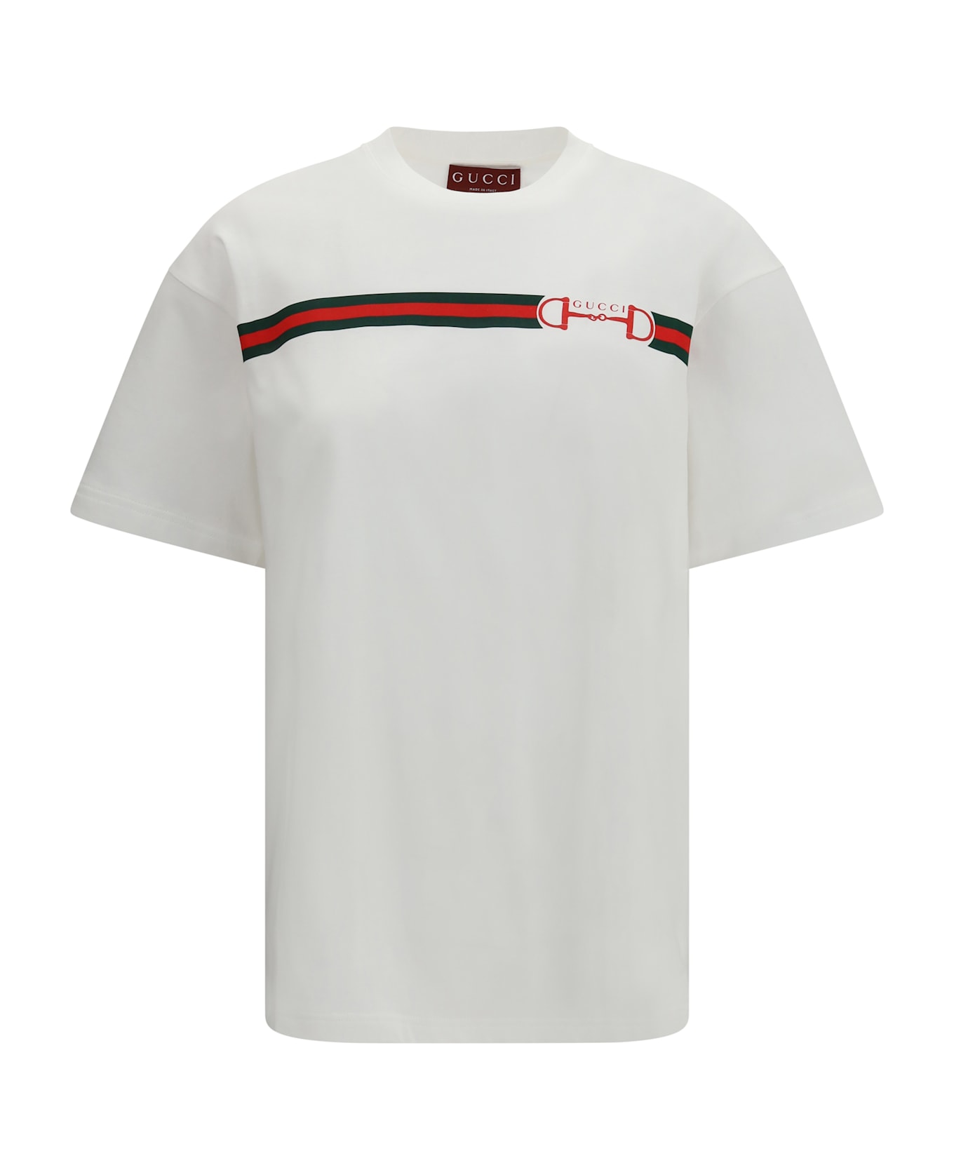 The t-shirt by gucci is made from pure cotton for optimal comfort and a fresh feel. featuring a nastro web print on the chest, which echoes the brand's iconic motif, it adds a distinctive touch to the design. the ribbed crew neck completes the look with a classic and refined detail. perfect for a casual yet luxurious look, this t-shirt is ideal for those seeking a simple yet elegant style.