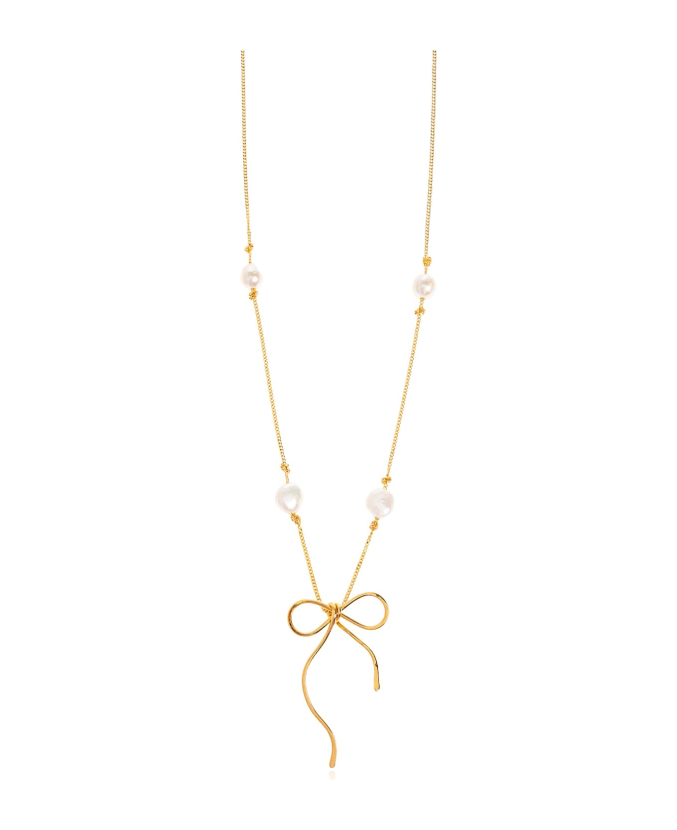 The Pendant Necklace by Marni artfully captures Italian elegance with a refined golden chain and four expertly placed statement pearls. Evoking a sense of timeless sophistication, its slim silhouette is flawlessly accentuated by a delicate gold bow pendant an exquisite nod to modern femininity inspired by Marni's signature eclectic spirit. An understated designer engraving on a polished rectangular tag further highlights the necklace's exclusivity. Crafted from premium brass and lustrous pearls, this piece embodies meticulous attention to detail and the house's reputation for bold, harmonious design. Why choose this product? Distinctive Italian design from the renowned Marni fashion house Intricate pearl accents elevate any ensemble with a touch of luxury Elegant bow-shaped pendant offers an artful focal point Secure lobster clasp ensures both convenience and peace of mind Signature designer logo for an exclusive finish