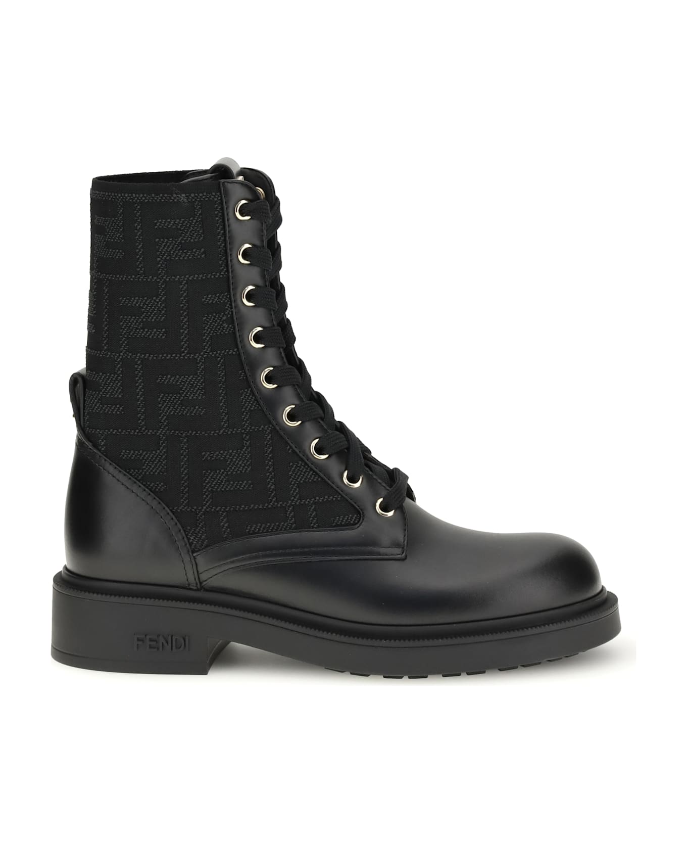 The ff leather biker boots by fendi reinterpret the classic biker spirit with an iconic, contemporary twist. made of black leather combined with stretch fabric decorated with the unmistakable ff pattern in shades of black, they feature a round toe lacing and elegant metal eyelets. details such as fendi roma lettering and gold-finish metal stitch selleria stitching further enhance the design. the rubber sole and heel, both with fendi lettering on the side, complete a model with a strong and recognizable character.