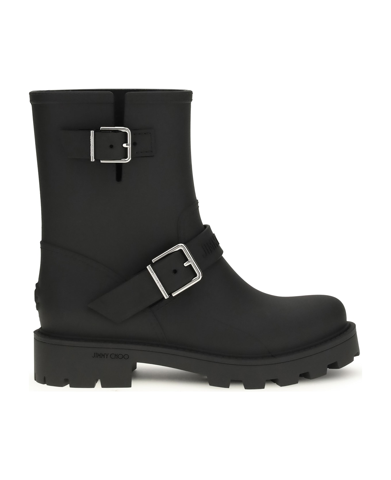 The tpu rain boots by jimmy choo offer a mix of style and function. made of bio-based tpu, they feature buckled details and a grooved sole that ensures stability. the rounded toe and jimmy choo logo add a distinctive touch, while the water-resistant construction makes them perfect for tackling rainy days with elegance.