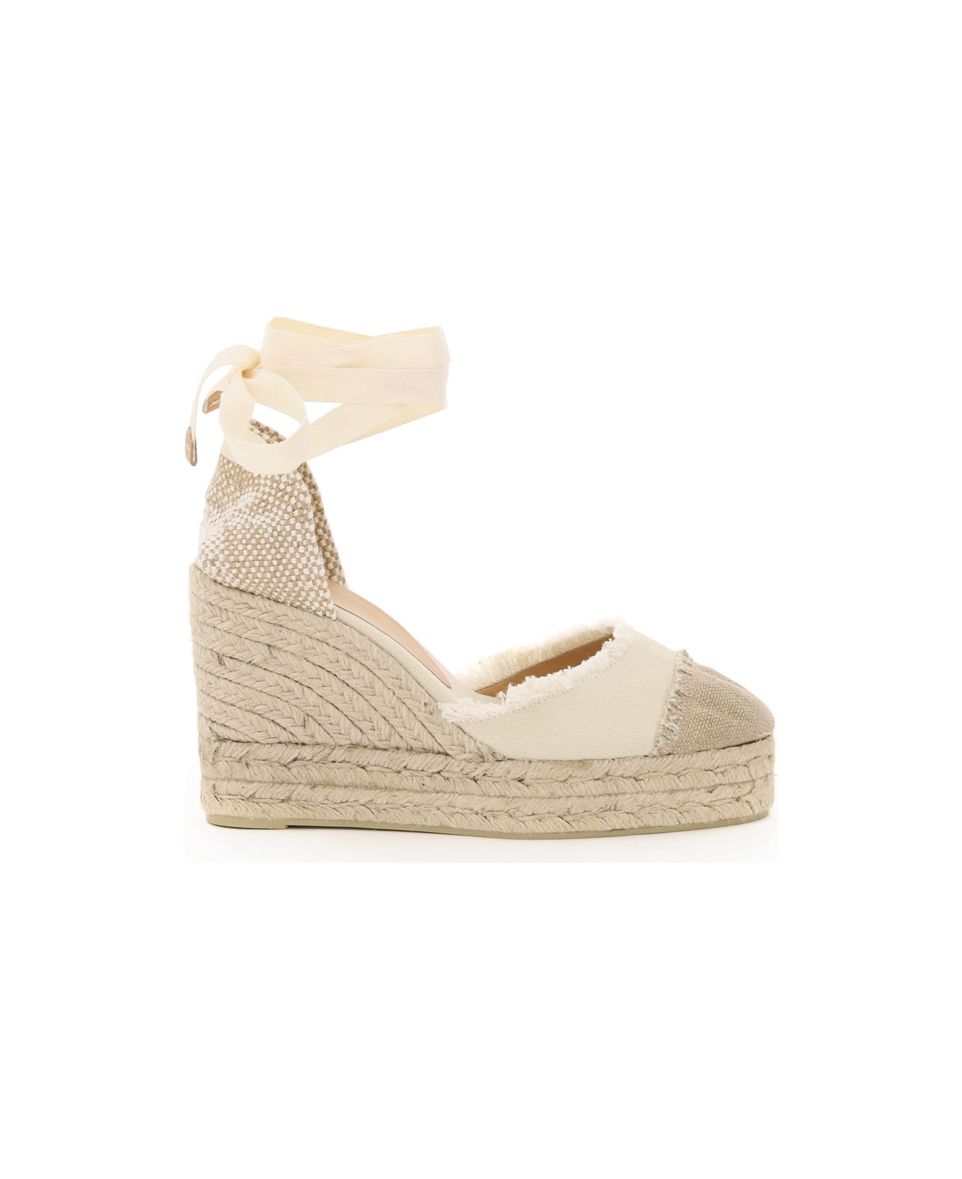 Catalina handcrafted espadrilles by Castaner with the front upper in two-tone cotton canvas enriched by fringed profiles. Heel with ribbon tied at the ankle, wedge covered in braided rope, canvas interior, rubber sole.