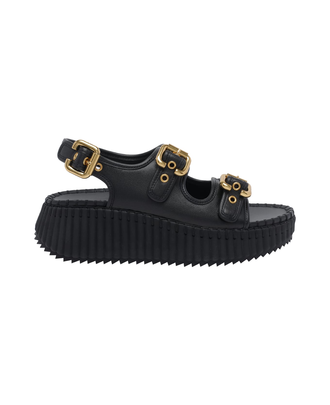 Chloe' black Nama wedge sandals, round toe, lateral buckles closure, leather upper
