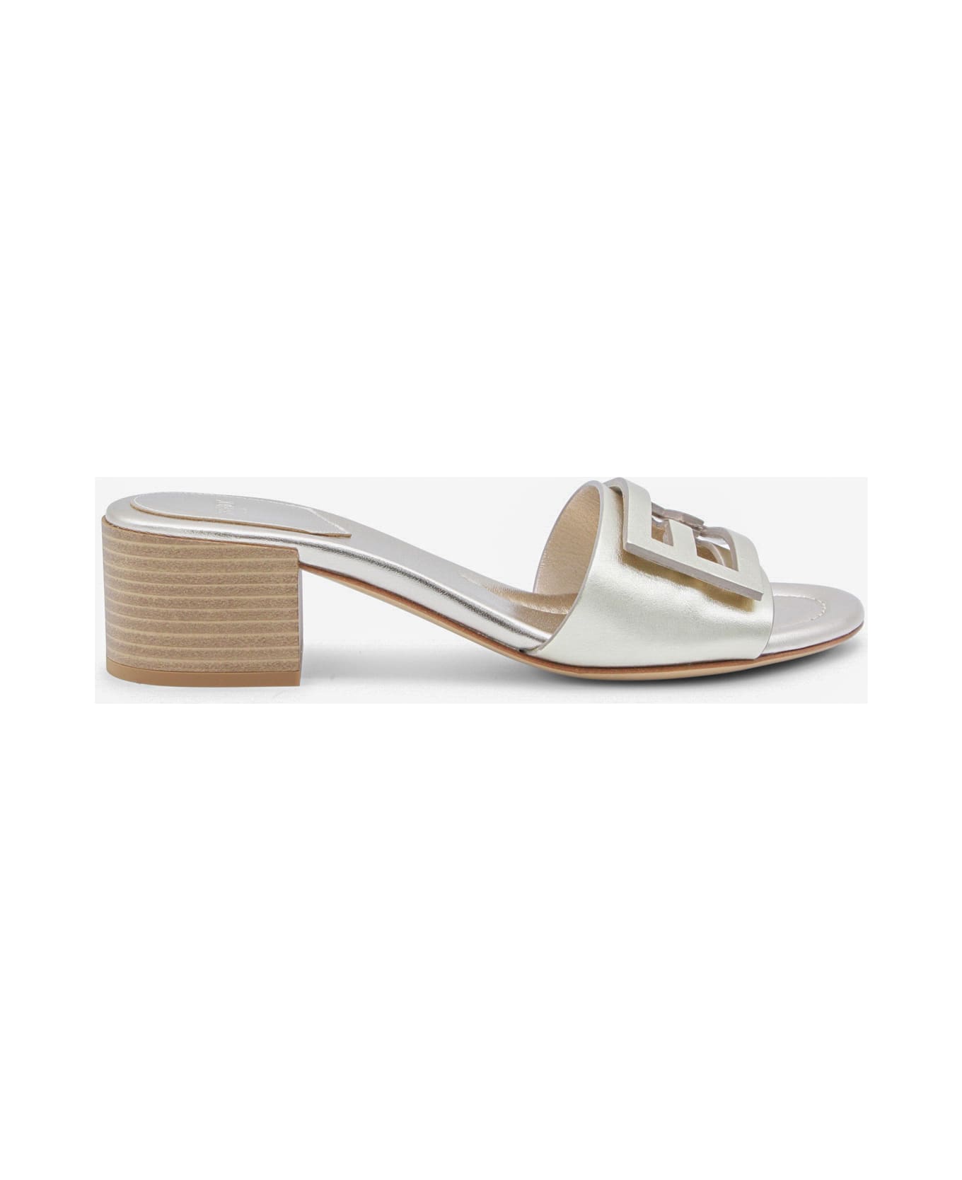 Platinum leather sandals from Fendi featuring round open toe, medium square heel, open back, frontal iconic FF logo and regular fit. Composition: _cover, 100% Le Sole, 100% Elastodiene