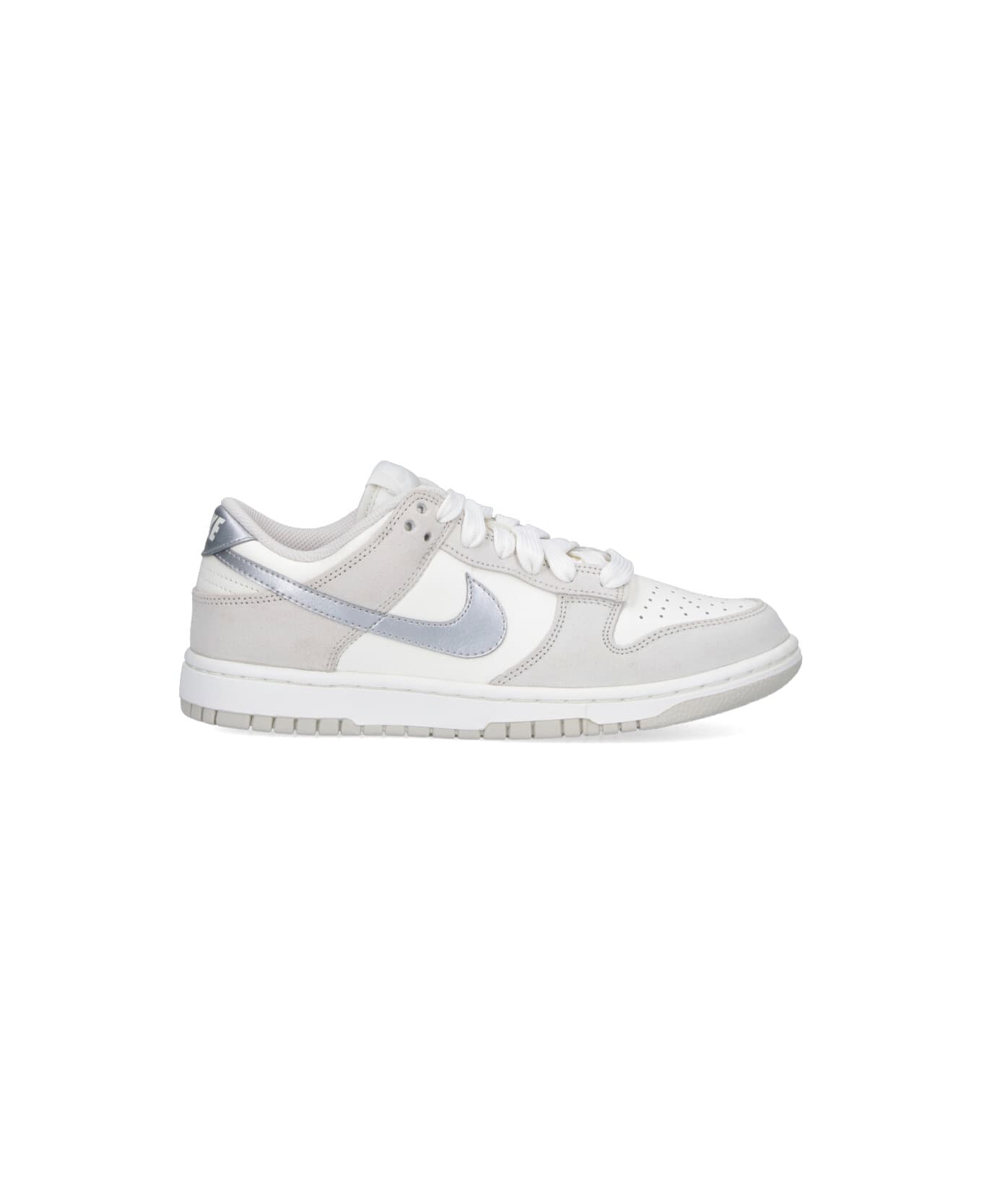 Nike "Dunk Low Retro" sneakers in white leather with gray suede trim, round toe, lace-up closure, logo label on the tongue, silver "Swoosh" logo on the side, white logo embroidery on the back tab, rubber sole.