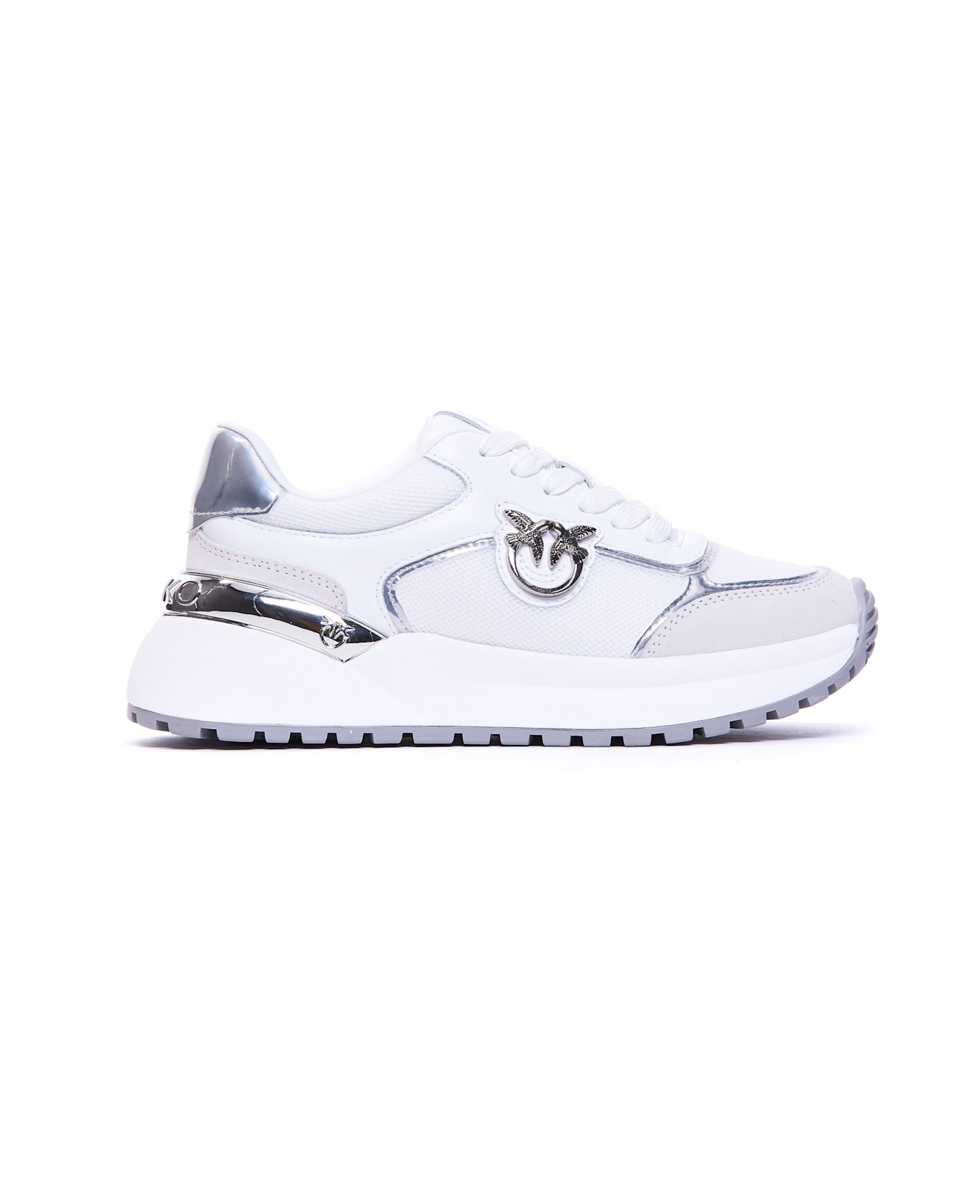 Pinko white and silver Gem 01 sneakers, leather, rubber and suede upper, rubber sole, round toe, lace closure, tongue and lateral logo, silver effect