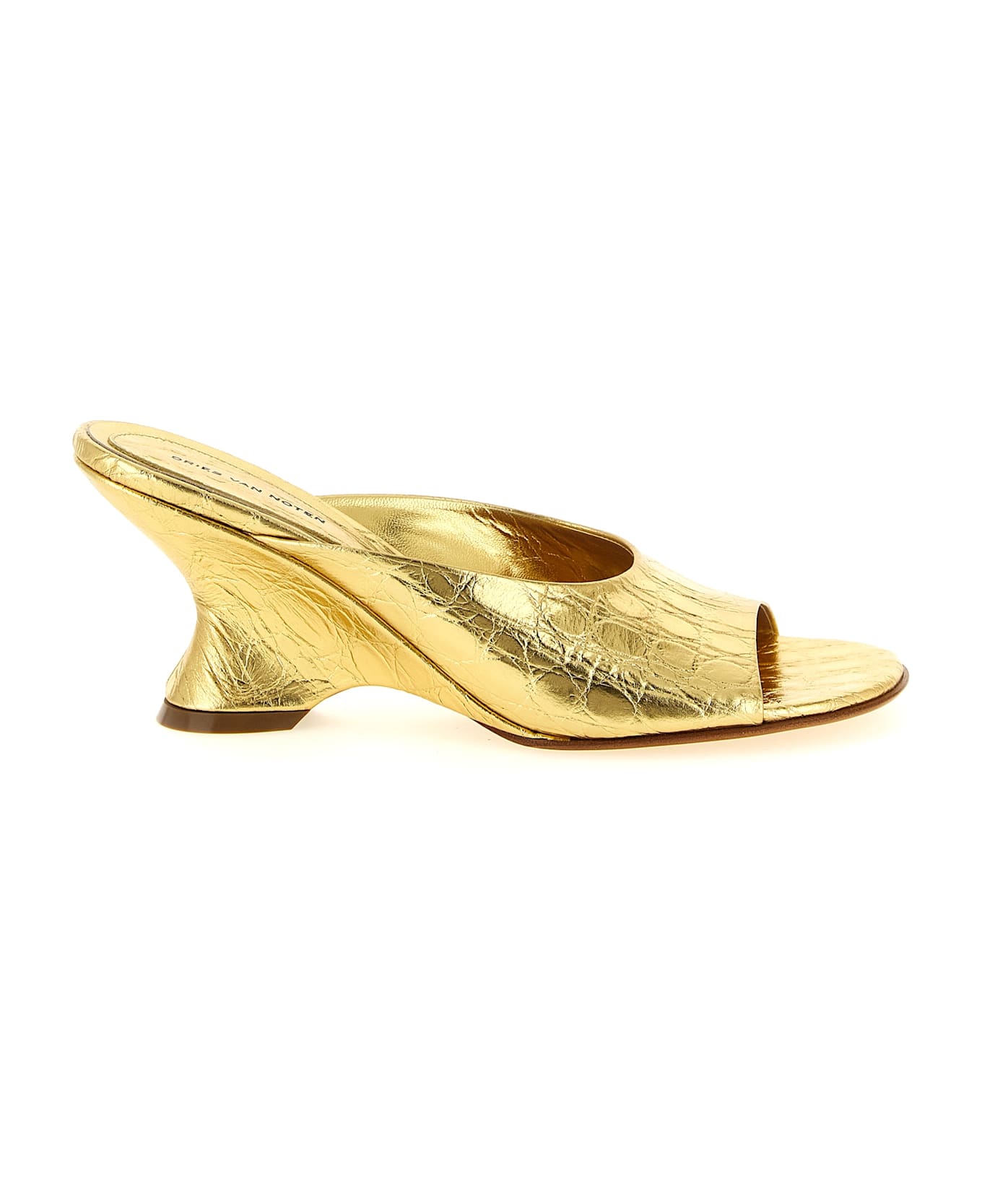 Laminated embossed leather mules with rounded toe, curved wedge heel, and leather sole.