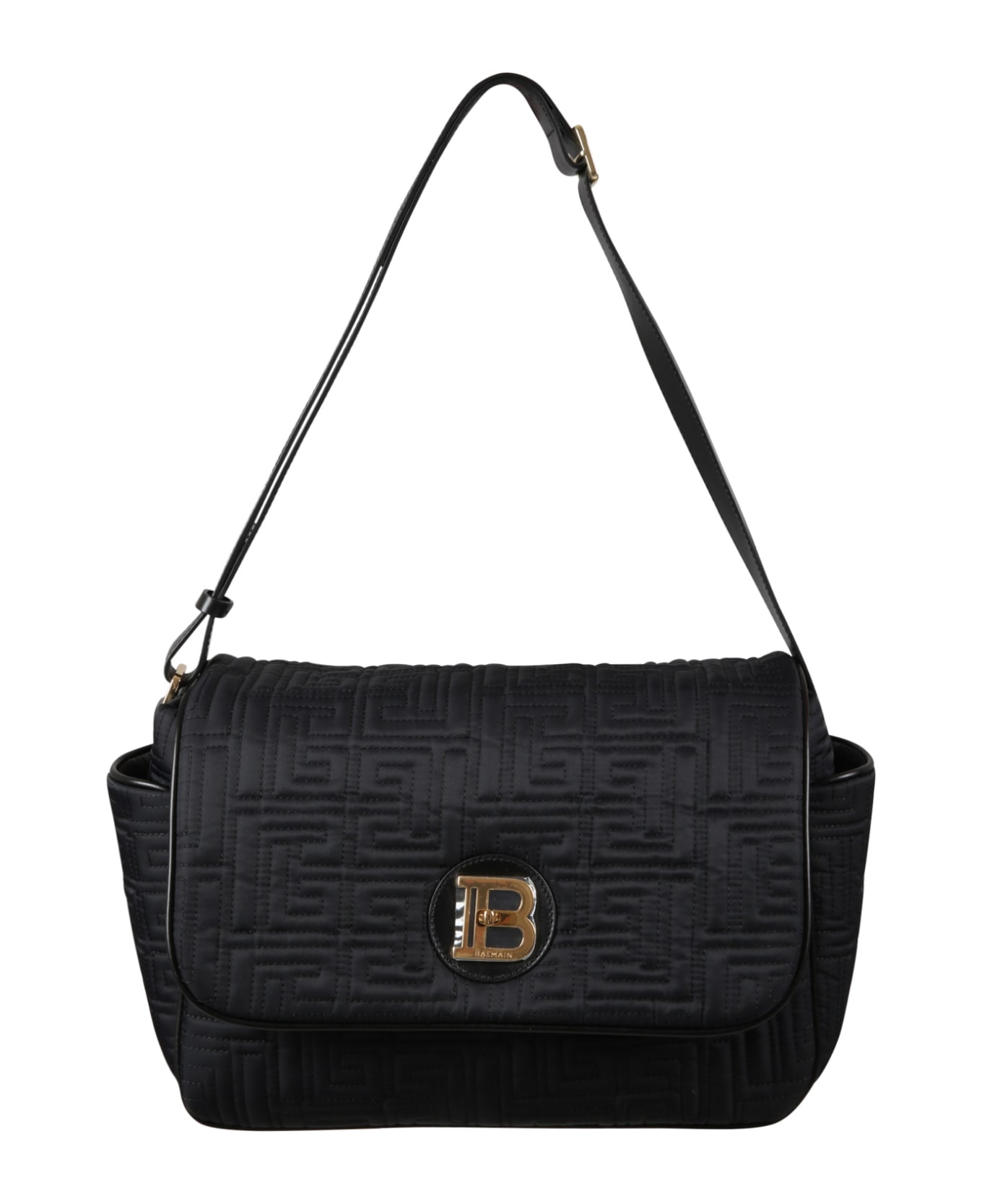 Quilted black changing bag, with adjustable shoulder strap, hook closure on the front, side pockets and internal changing mat. It is embellished with golden metallic logo on the front.